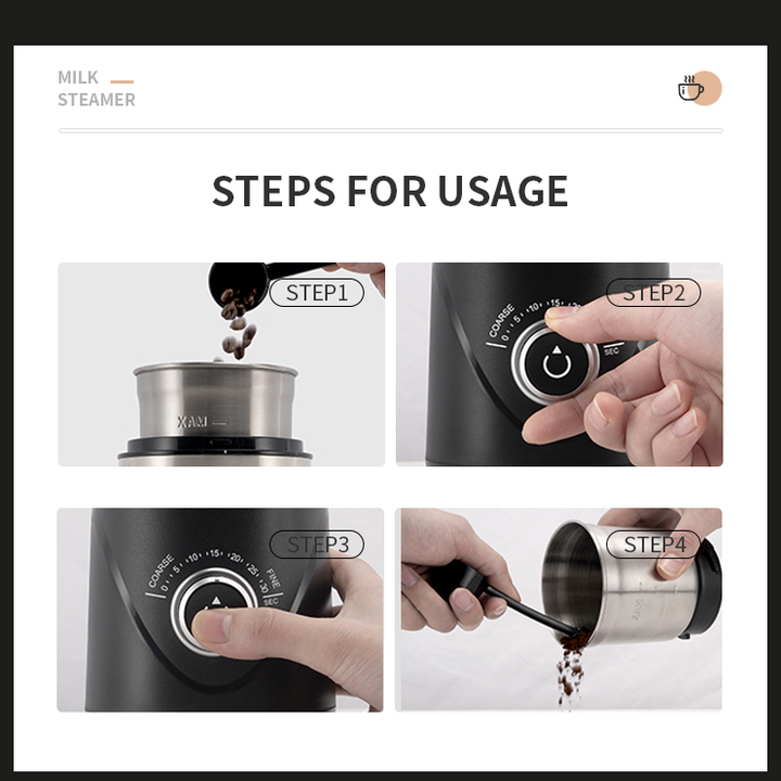 - Máy xay đa năng không chỉ hạt cà phê mà còn xay được hạt tiêu, quế, ớt khô, đậu nành, đậu lành, gạo, đường pha lê Thông số kỹ thuật sản phẩm