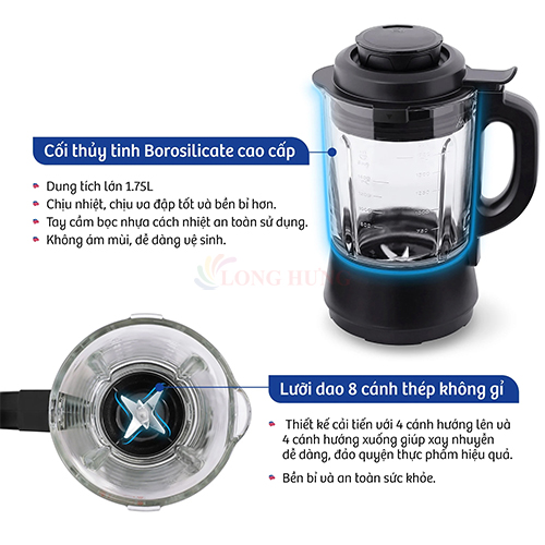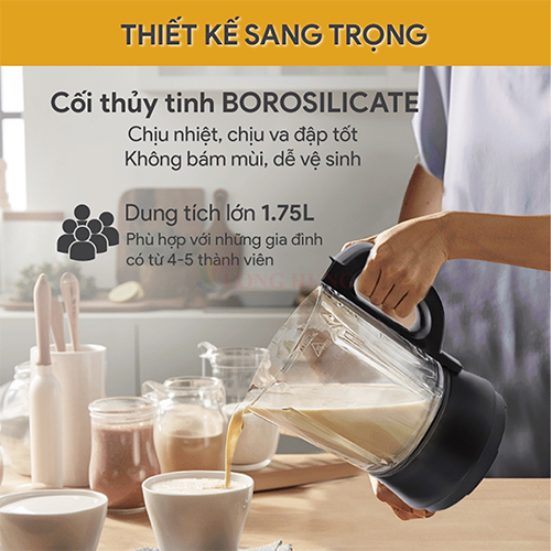 Dung tích cối thủy tinh: 1.75L (Dung tích tối đa khi xay là 1.75L, dung tích tối đa khi nấu là 1.2 đến 1.4L)