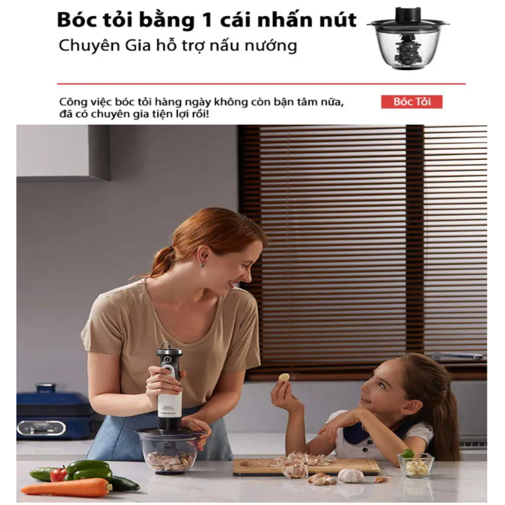 - Bộ sản phẩm bao gồm: Bộ sản phẩm bao gồm 1 thân máy xay; 1 đầu xay sinh tố, thực phẩm mềm; 2 cốc xay; 1 bộ dụng cụ xay thịt, 1 dụng cụ đánh trứng và 1 dụng cụ bóc tỏi