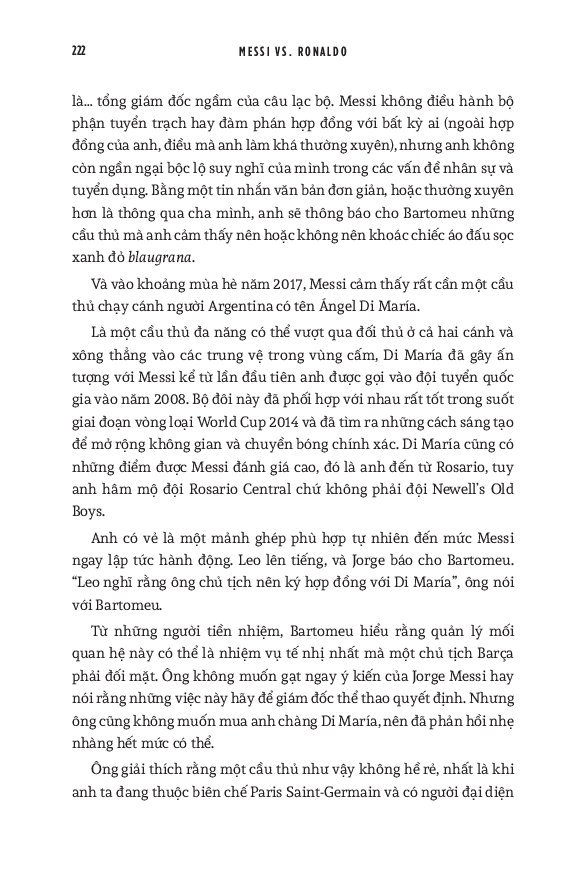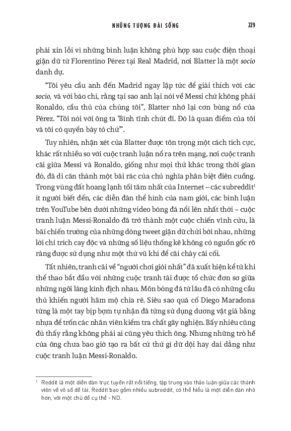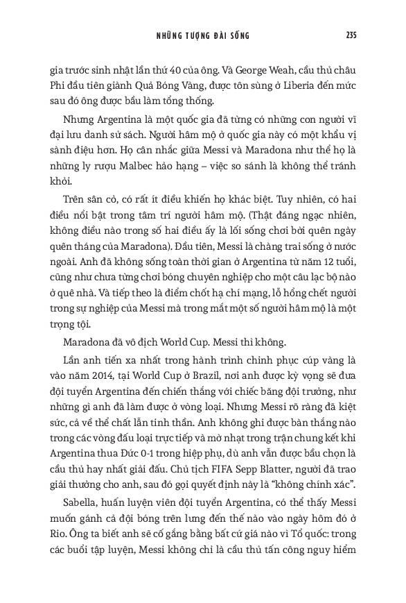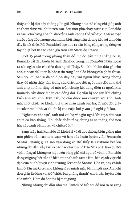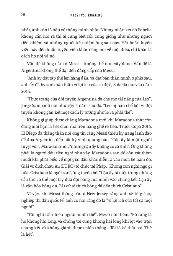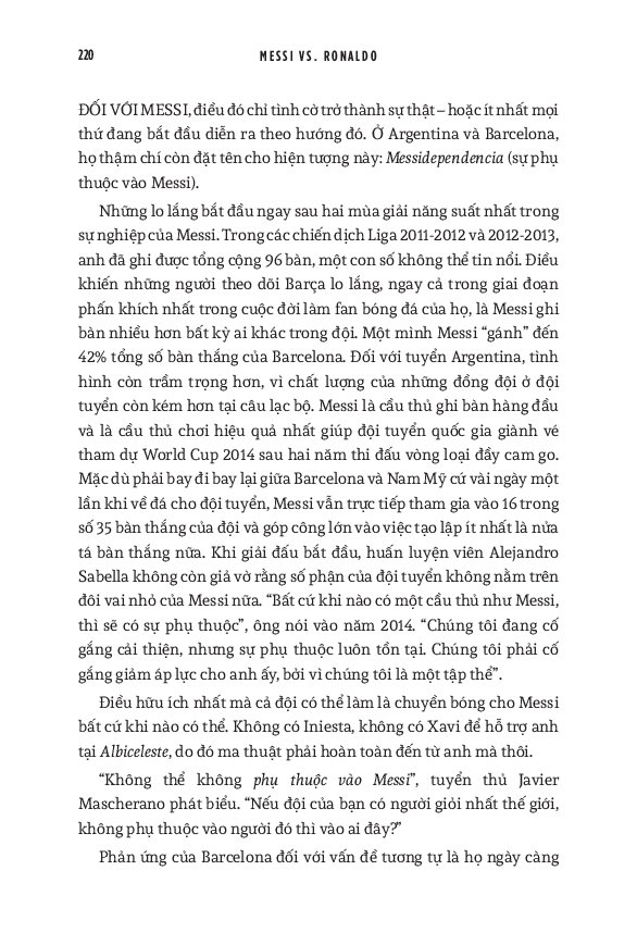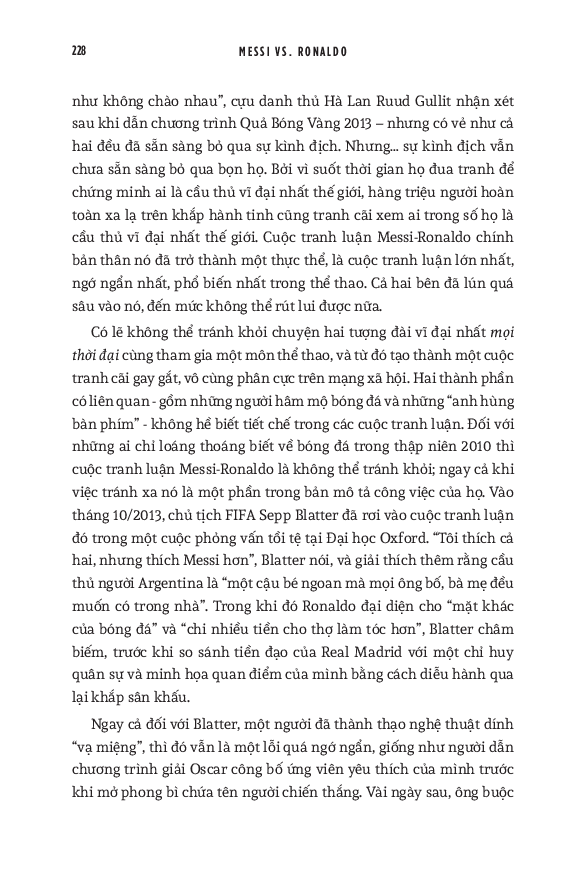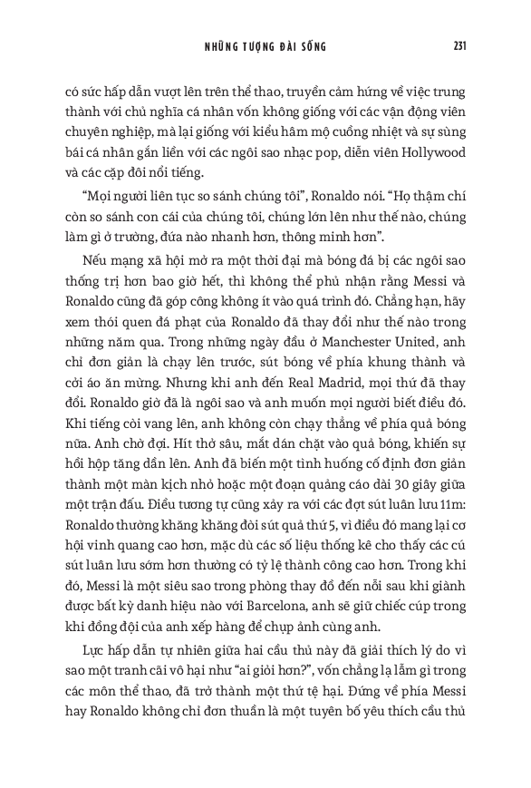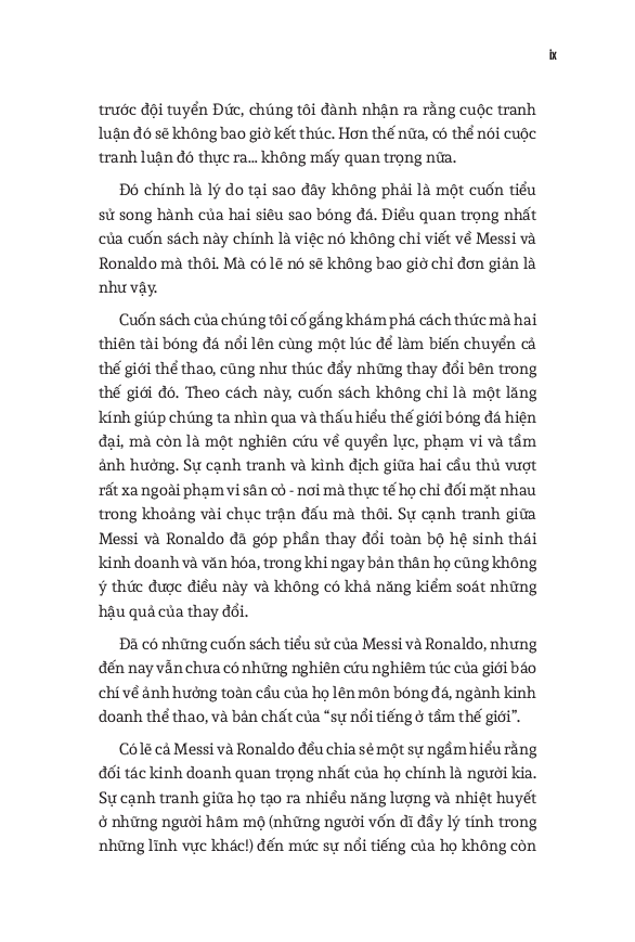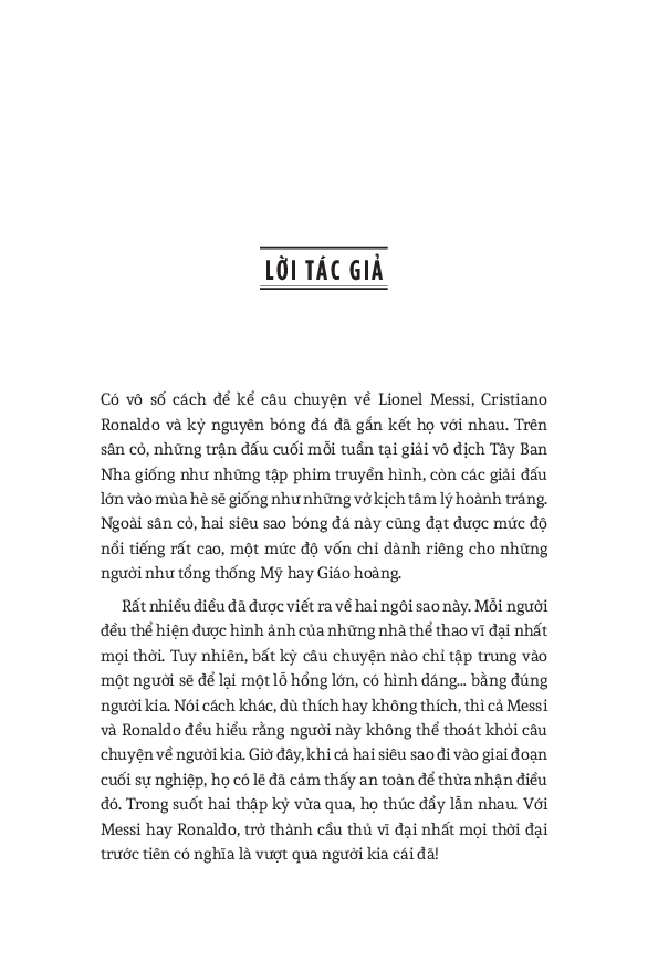 World Cup 2022 có lẽ là giải vô địch thế giới cuối cùng với cả Messi và Ronaldo. Do đó, cuốn sách này cũng dành nhiều trang đánh giá về di sản của họ cho bóng đá, cũng như phân tích những ảnh hưởng mà tài năng của họ tạo ra, cả tích cực lẫn tiêu cực. Hơn cả việc đơn thuần liệt kê những thành tích của hai siêu sao, đây thực sự là một “tiểu sử của cuộc đua tranh” vốn đã trở thành một lăng kính quan trọng để hiểu về quá khứ, hiện tại và tương lai của bóng đá thế giới.