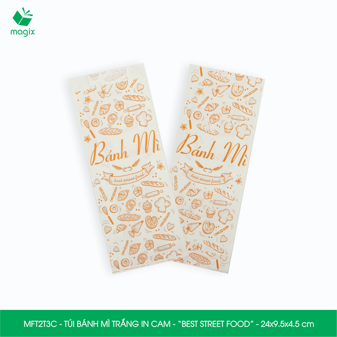 Túi đựng bánh mì truyền thống Việt Nam với thiết kế xếp hông, túi dán 3 biên có kích thước 24x9.5x4.5 cm. Chất lượng giấy đảm bảo vệ sinh an toàn thực phẩm, được nhiều cửa hàng, chuỗi bánh mì tin dùng sử dụng.    ƯU ĐIỂM Tiện lợi, đảm bảo vệ sinh an toàn thực phẩm: Thiết kế dạng túi mở vừa vặn ổ bánh mì. Sử dụng chất liệu giấy thấm dầu chuyên dành cho ngành công nghiệp thực phẩm giúp bảo vệ bánh mì khỏi ẩm mốc và giữ bánh tươi ngon lâu hơn. Tăng tính thẩm mỹ, chuyên nghiệp: Túi bánh mì in được sử dụng như một phương tiện quảng cáo nhỏ gọn và hiệu quả với thiết kế in ấn họa tiết đẹp mắt Thân thiện môi trường: Được làm từ giấy thực phẩm chất lượng cao, giúp giảm thiểu lượng rác thải nhựa và bảo vệ môi trường.   QUY CÁCH KỸ THUẬT  Kích thước: Xếp hông: 4.5 cm/ Cao: 24 cm/ Ngang: 9.5 cm Chất liệu: Giấy MG40 chuyên dùng cho thực phẩm đạt tiêu chuẩn FDA Mỹ Định lượng: 40gsm Mã sản phẩm - Kiểu in:  • MFT2T1C - Túi bánh mì trắng in cam - "Chả cá"   • MFT2T2C - Túi bánh mì trắng in cam - "Món ngon đường phố"  • MFT2T3C - Túi bánh mì trắng in cam - "Best street food"  • MFT2V4N - Túi bánh mì vàng in nâu - "Bông lúa"  • MFT2V5X - Túi bánh mì vàng in xanh - "Best street food"  • MFT2T6VD - Túi bánh mì trắng in vàng đỏ - "Premium quality"   • MFT2N7DD - Túi bánh mì nâu in đỏ đen - "Cô gái"   LƯU Ý Bảo quản sản phẩm nơi khô ráo, sạch sẽ tránh tiếp xúc trực tiếp với ánh nắng mặt trời và nhiệt độ cao.
