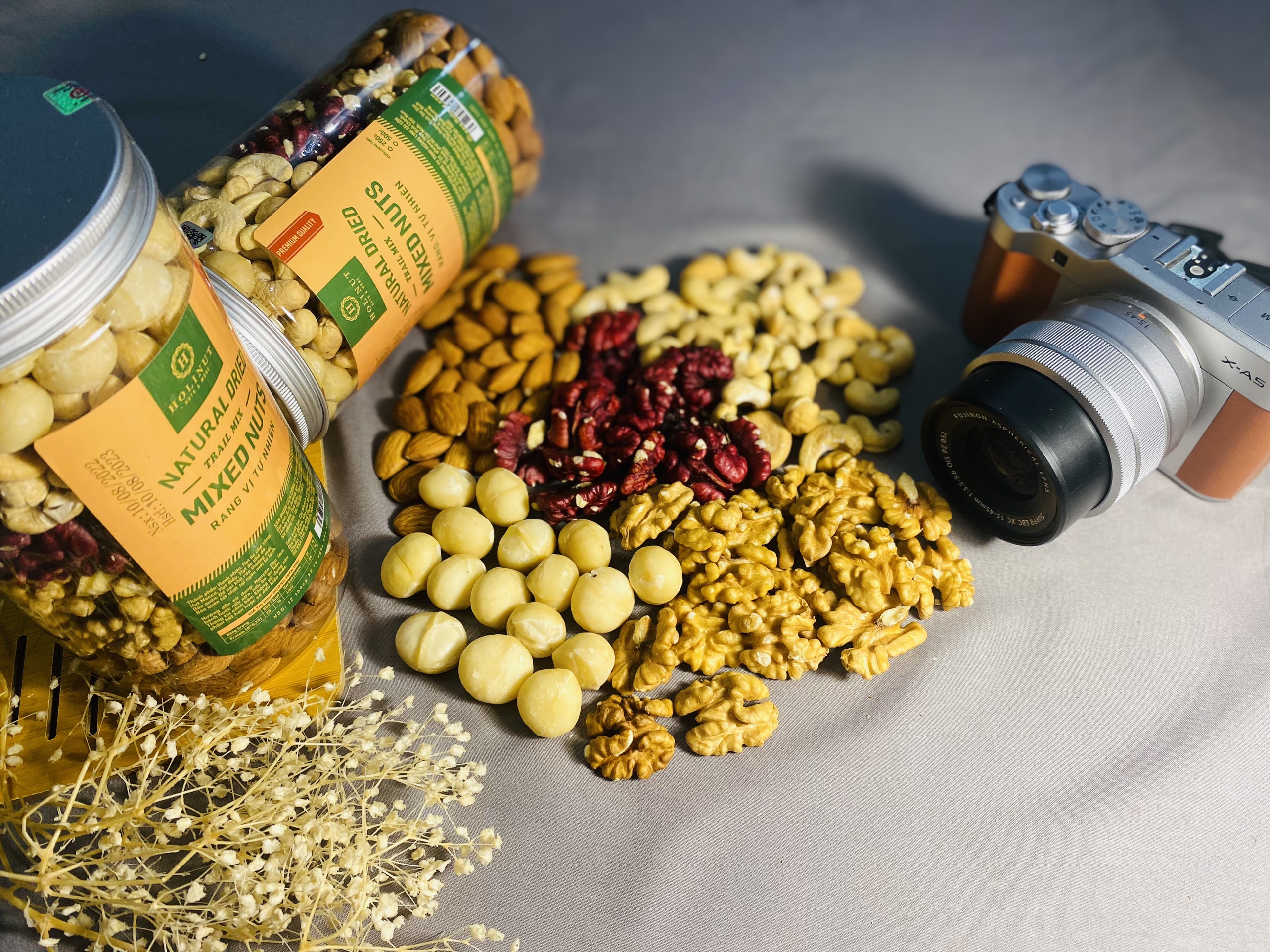 Thành phần: Nhân óc chó vàng, nhân óc chó đỏ, nhân macca, hạt hạnh nhân, hạt điều.