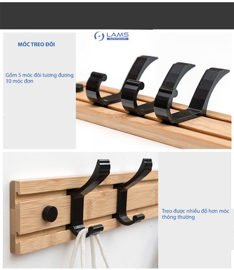 • Loại 5 đầu móc: Kích thước: thanh treo gỗ 6x1.2x50cm Móc treo đôi gồm 5 móc đôi (tương đương 10 móc đơn)