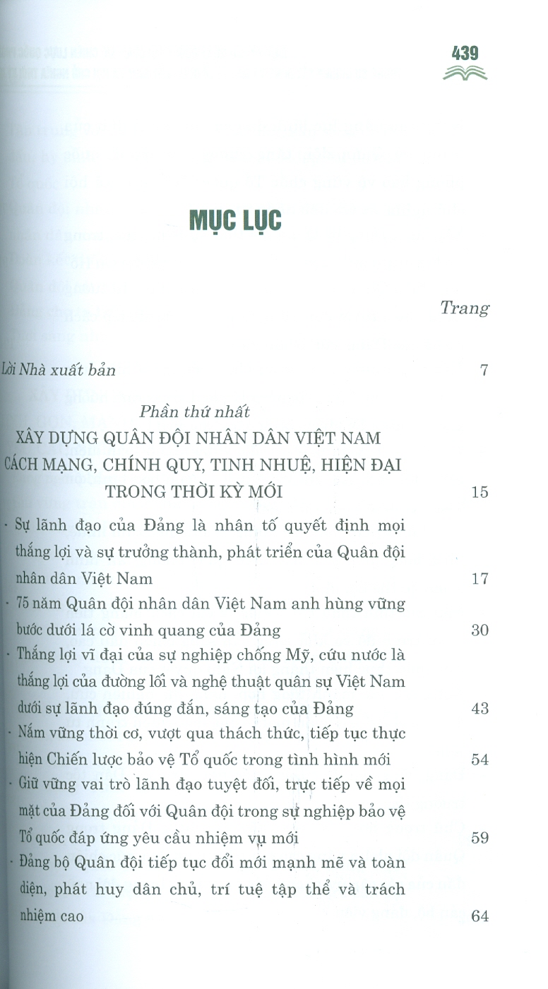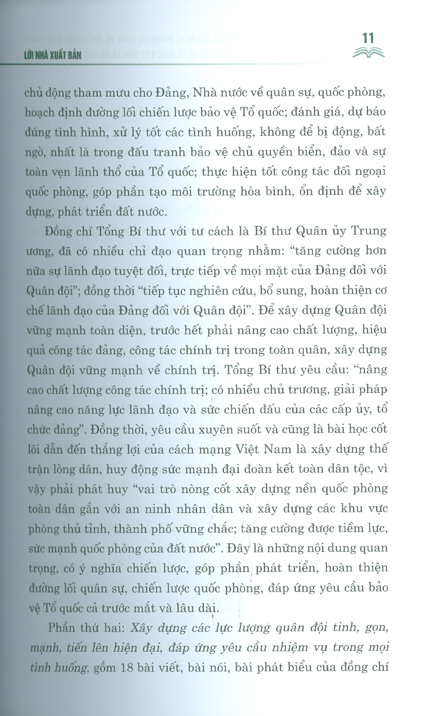 Cuốn sách gồm 39 bài viết, bài phát biểu, trả lời phỏng vấn của đồng chí Tổng Bí thư Nguyễn Phú Trọng, Bí thư Quân ủy Trung ương, thể hiện tư tưởng nhất quán, xuyên