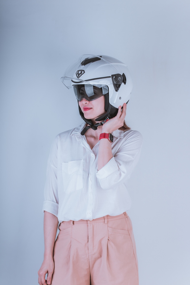 Mũ bảo hiểm được trang bị lớp kính giấu bên trong, có thể kéo ra giấu vào tùy theo nhu cầu sử dụng. Ngoài ra, nón còn đính kèm 3 khuy bấm phía trên mũ,