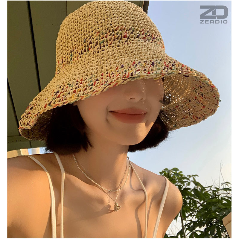 Mũ cói rơm vành phẳng nữ mùa hè phiên bản Hàn Quốc chống nắng UV cho kỳ nghỉ Nón đi biển Paris thời trang hàng đầu Pháp Chất liệu cói