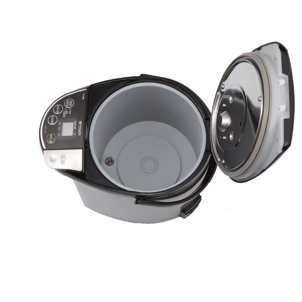 Bình thủy điện hiệu Tiger thân inox viền đen, lồng tráng men, đế xoay, nắp tháo rời, dây rời, màn hình LCD, 4 chế độ cài đặt nhiệt độ giữ ấm, có chế độ khóa nước an toàn tự động, có chế độ nấu sôi lại, chức năng làm khử mùi, chức năng tiết kiệm điện.