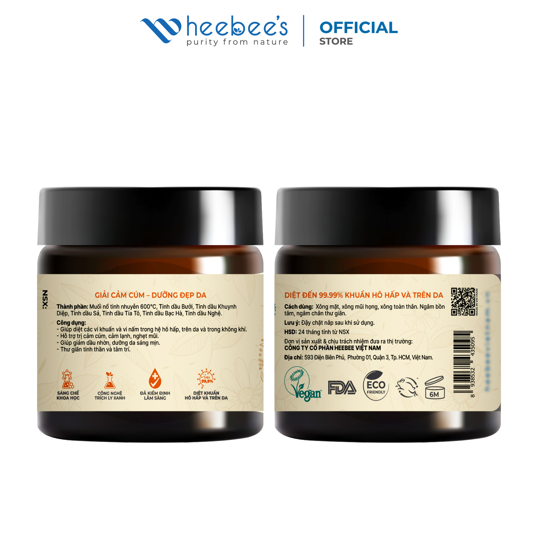 Mua tại TiktokMUỐI XÔNG THẢO DƯỢC GIẢI CẢM VÀ LÀM ĐẸP HEEBEE'S 100G ĐIỂM NỔI BẬT Lấy cảm hứng từ những ưu điểm vượt trội, sức mạnh chữa lành từ muối biển, Heebee's đã nghiên cứu làm mới liệu pháp làm đẹp này bằng một cách riêng biệt, thuần khiết. Chúng tôi đã tìm kiếm và tỉ mỉ lựa chọn những hạt muối biển tự nhiên từ ruộng muối Bạc Liêu, sau đó đem nung ở 600°C để loại bỏ hoàn toàn tạp chất, đạt độ tinh khiết tối đa. Sản phẩm là thành quả nghiên cứu đột phá của đội ngũ R&D Heebee's, được CẤP BẰNG SÁNG CHẾ KHOA HỌC ĐỘC QUYỀN bởi Bộ Khoa học và Công nghệ Việt Nam. Với cam kết “Thuần Xanh - Chuẩn Lành” Muối Xông Heebee's không chỉ t.r.ị l.i.ệ.u sức khỏe, hỗ trợ hô hấp và làm đẹp da, mà còn là liệu pháp thư giãn tinh thần, hướng đến một lối sống xanh, an toàn và bền vững. THÀNH PHẦN CHÍNH ĐIỀU GÌ KHIẾN MUỐI XÔNG THẢO DƯỢC HEEBEE'S KHÁC BIỆT? CAM KẾT SẢN PHẨM NGUYÊN LIỆU THÀNH PHẦN ĐẦY ĐỦ KIỂM ĐỊNH CHẤT LƯỢNG AN TOÀN THEO QUI ĐỊNH AN TOÀN MỸ PHẨM ASEAN. KHÔNG SỬ DỤNG NGUYÊN LIỆU KHÔNG RÕ NGUỒN GỐC. Không chứa Suflate (SLSs), Silicons, Parabens, Phthalates, Triclosan, Dyes, PEGs, Formaldehyde, Vi Sinh Vật, Kim Loại Nặng (Hg,Pb, Asen), Màu tổng hợp. CÔNG DỤNG ‣ Diệt khuẩn, virus, nấm trong không khí và hệ hô hấp, giảm nhanh tình trạng cảm cúm, cảm lạnh, nghẹt mũi, v.i.ê.m họng, cải thiện chức năng hô hấp, giảm sưng v.i.ê.m. ‣ K.í.c..h thích vi tuần hoàn, bổ sung khoáng chất, loại bỏ bụi bẩn ẩn dưới da, làm sạch sâu và bảo vệ da khỏi các vấn đề da liễu, giảm dầu nhờn, dưỡng da sáng mịn, hồng hào. ‣ Hỗ trợ khử khuẩn không gian, thanh lọc, làm nhẹ cơ thể, giảm căng thẳng, mệt mỏi, mang lại cảm giác thư thái. ‣ Đa Dụng - Hiệu quả - Tiện Lợi vừa xông mũi họng, xông toàn thân (tắm ngâm) và xông làm đẹp da mặt. ĐỐI TƯỢNG SỬ DỤNG ‣ Phù hợp cho mọi giới tính và độ tuổi. Khuyến cáo: ‣ Không sử dụng cho phụ nữ có thai, cho con bú và trẻ em dưới 4 tuổi. ‣ Những người mẫn cảm với các loại tinh dầu và muối biển thành phần trên đây. ‣ Sử dụng theo liều lượng đã hướng dẫn. ‣ Chỉ dùng ngoài da, không dùng cho ăn và/hoặc uống. ‣ Tham khảo ý kiến chuyên gia nếu cơ thể mẫn cảm với tinh dầu hoặc có các b.ệ.n.h lý khác CÁCH SỬ DỤNG Lưu ý: Sau khi xông, lau hoặc rửa nhẹ bằng nước sạch, để da nghỉ 30–45 phút trước khi thực hiện các bước dưỡng da khác, nhằm để tinh dầu phát huy tối đa hiệu quả. HƯỚNG DẪN BẢO QUẢN ‣ Bảo quản nơi thoáng mát, khô ráo, tránh xa ánh nắng mặt trời và nguồn nhiệt, ‣ Đậy kín nắp ngay sau khi sử dụng để tránh tinh dầu bị bay hơi, giảm chất lượng ‣ Tránh xa tầm tay trẻ em và vật nuôi. THÀNH PHẦN CHI TIẾT Muối nổ tinh nhuyễn 600oC, tinh dầu Bưởi (Citrus grandis peel oil), Tinh dầu Khuynh Diệp (Eucalyptus sp. leaves oil), Tinh dầu Sả (Cymbopogon winterianus leaves oil), Tinh dầu Tía Tô (Perilla frutescens leaves oil), Tinh dầu Bạc Hà (Mentha sp. leaves oil), Tinh dầu Nghệ (Curcuma longa rhizome oil).