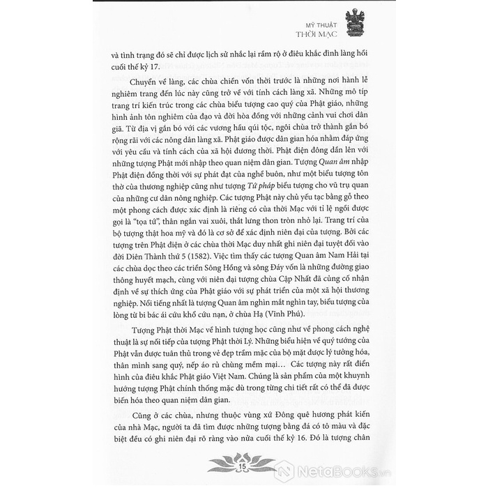 Mỹ Thuật Thời Mạc Để tiến tới biên soạn bộ lịch sử mỹ thuật Việt Nam, trong nhiều năm qua, Viện Mỹ thuật chúng tôi đã lần lượt tổ chức viết và cho công bố các tập Mỹ thuật thời Lý (1973), Mỹ thuật thời Trần (1977) Mỹ thuật thời Lê Sơ (1978) và Mỹ thuật Huế (1992). Nam trong chương trình chung đó, công trình Mỹ thuật thời Mạc cũng đã được hoàn thành bản thảo từ năm 1985. Nhưng vì nhiều lý do khác nhau, đến nay cuốn sách mới ra mắt bạn đọc được. Cũng như các tập trước, công trình Mỹ thuật thời Mạc là tập hợp các bài viết về nghệ thuật kiến trúc, điêu khắc, trang trí và gốm mà tác giả là những cán bộ của Viện. Mở đầu là một bài viết khái quát về mỹ thuật thời Mạc. Tác giả đưa ra những nhận định, đánh giá chung về nền mỹ thuật, thời này cũng như qủa trình nhận diện và định vị nó trong lịch sử mỹ thuật. Tiếp theo là phần viết về nghệ thuậ