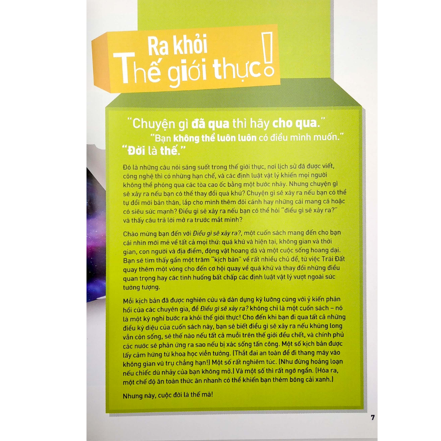 Mua tại Tiktok"Điều gì sẽ xảy ra?" là một cuốn sách mang đến cho các em nhỏ cái nhìn mới mẻ về tất cả mọi thứ: quá khứ và hiện tại, không gian và thời gian, con người và địa điểm, động vật hoang dã và một cuộc sống hoang dại. Các em sẽ tìm thấy gần một trăm “kịch bản” về rất nhiều chủ đề, từ việc Trái Đất quay thêm một vòng cho đến cơ hội quay về quá khứ và thay đổi những điều quan trọng hay các tình huống bất chấp các định luật vật lý vượt ngoài sức tưởng tượng.