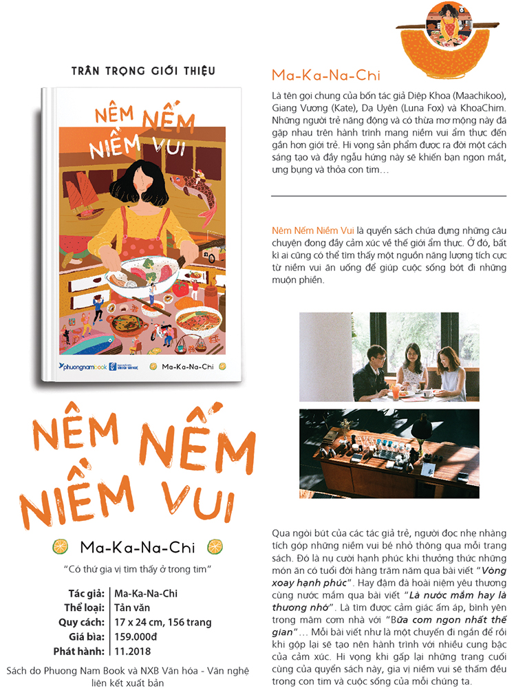 Trong quyển sách này, bạn có thể sống trong không khí ấm áp của mâm cơm gia đình, tận hưởng niềm hân hoan bên một chén nước mắm nhỏ, hay cảm thấy may mắn khi thưởng thức những món ăn có tuổi đời gần trăm năm. Là cảm giác tự tin cho những cô gái với nỗi sợ cầm dao khi vào bếp, hay đơn giản là rụng rời trước vị ngon của những món ăn đường phố Tất cả tụ họp nơi đây để làm nên thứ gia vị giúp bất kỳ ai khi "nếm" đầu cảm thấy cuộc sống đậm đà hơn.