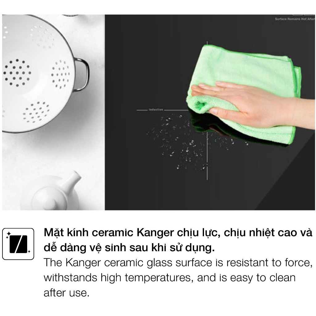 Công suất lớn lên đến 3000W, xào nấu nhanh chóng. Mặt kính ceramic Kanger chịu lực, chịu nhiệt cao và dễ dàng vệ sinh sau khi sử dụng. Điều khiển cảm ứng kết hợp núm vặn cùng 9 mức nhiệt giúp bạn điều chỉnh nhiệt độ phù hợp với nhu cầu nấu nướng tiện lợi.