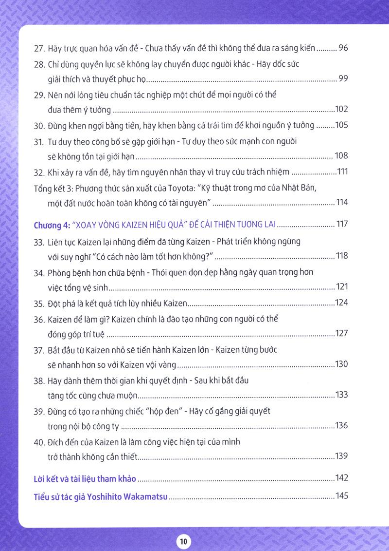 Nghệ Thuật Kaizen Tuyệt Vời Của Toyota Kaizen là hệ thống phát huy trí tuệ con người Thu được thành quả lớn từ việc thực hiện những việc nhỏ Chính lúc gặp khó khăn mới là cơ hội Phương thức sản xuất Toyota có nói rằng “thắng thua được quyết định bởi số lượng của trí tuệ được đưa ra”. Nếu chỉ làm những việc giống người khác thì không thể tạo ra năng lực cạnh tranh. Ví dụ, nếu sử dụng cùng loại máy móc để sản xuất cùng một loại sản phẩm với đối thủ, thì không thể nào chiến thắng được. Việc đưa “trí tuệ của con người” vào cách sử dụng máy móc là cần thiết. Cùng một máy móc, nhưng tùy theo cách tùy chỉnh và hàm lượng trí tuệ của con người mà công ty có thể nâng cao sức cạnh tranh đối với công ty khác. Tôi đột nhiên suy nghĩ không biết từ trước tới giờ, Toyota đã tích lũy được bao nhiêu trí tuệ. Theo số liệu thống kê, có một năm tổng số phương án Kaizen đã được đề xuất là 650.000 phương án. Từ năm 1950, Toyota bắt đầu áp dụng chế độ “đề xuất Kaizen”. Không phải năm nào cũng có số lượng phương án Kaizen lớn như trên, nhưng giả sử mỗi năm có khoảng 500.000 phương án được thực hiện thì trong 60 năm qua, Toyota đã thực hiện khoảng 30 triệu phương án Kaizen. Đây chính là cơ sở để Toyota trở thành số một thế giới. Mỗi năm Toyota sản xuất 10 triệu xe tại hàng chục quốc gia trên thế giới, tạo ra lợi nhuận trên 2 nghìn tỷ yên. Có thể nói nguồn gốc tạo ra sự phát triển của Toyota chính là từ 30 triệu phương án Kaizen này. Có thể những phương án Kaizen chỉ là những “trí tuệ nhỏ”, nhưng khi tập hợp được 1 triệu, 2 triệu “trí tuệ nhỏ”, Toyota có thể tạo ra sức mạnh áp đảo hoàn toàn trên phạm vi toàn thế giới. Sự phát triển của Toyota là minh chứng cho điều này. Khởi nguồn của Kaizen là những “để ý nhỏ”. Nếu một công việc thật khó làm, quá vất vả, quá khó, nhân viên của Toyota sẽ không chịu đựng hay bỏ qua những điều này. Họ suy nghĩ xem có cách nào tốt hơn hay không? Nếu có thì thử làm, thử thay đổi xem thế nào. Ban đầu nhiều trường hợp không có kết quả như mong đợi, nhưng khi đạt được thành quả người thực hiện sẽ vô cùng hạnh phúc. Những ví dụ thành công cũng sẽ trở thành tài sản chung của toàn công ty. Mỗi dịp đầu xuân, Toyota lại đón thêm nhiều nhân viên mới. Họ vừa rời ghế nhà trường, đặt chân vào xã hội nên chắc chắn sẽ gặp nhiều khó khăn. Nếu họ chỉ vì thế mà chán ghét thì sẽ khó trưởng thành được. Thấy vấn đề mà bỏ qua thì sẽ không thể vượt qua giới hạn bản thân. Điều quan trọng là phải dùng cái đầu để suy nghĩ “làm thế nào để vượt qua được khó khăn?”, “làm thế nào để kaizen vấn đề?”. Trong quá trình tư duy này chắc chắn trí tuệ của con người sẽ được đưa ra. Từng tiến bộ riêng lẻ tuy nhỏ, nhưng đến lúc nhận ra thì bản thân đã tiến bộ rất xa. Sự tiến bộ của con người là không giới hạn Những năm gần đây, ngày càng nhiều người trẻ thử sức với sân chơi toàn cầu. Có những tuyển thủ Nhật Bản có mặt trong đội bóng chày chuyên nghiệp Mỹ, có những tuyển thủ đầu quân cho các đội bóng chuyên nghiệp của Italia. Không chỉ thể thao mà cả những lĩnh vực nghệ thuật, học vấn, kinh tế, giới trẻ Nhật Bản cũng đang tạo được những điểm nhấn trên trường quốc tế. Mặc dù Nhật Bản đã và đang tạo nên nhiều thành quả nhưng không có nghĩa ngay từ ban đầu họ đều tiến hành thuận lợi. Ngược lại, họ đã gặp vô vàn những khó khăn. Nếu là vận động viên thể thao, họ có thể bị các báo chí cười chê. Nếu là nhà khoa học thì họ có thể bị cười nhạo về trình độ tiếng Anh…Có người không thể vượt qua những tình huống này, nhưng không ít bạn trẻ suy nghĩ “Đâu là vấn đề, bản thân thiếu điều gì?”, “Phải làm gì để giải quyết vấn đề” và nỗ lực thử làm lại để sửa sai. Tất cả những điều này chính là Kaizen. Điểm xuất phát của Kaizen là những khó khăn, là vấn đề, là những điều thiếu sót, và mong muốn “làm công việc tốt hơn”. Có lẽ sẽ rất khó để tìm được ngay lời giải cho những vấn đề kể trên. Nếu từ bỏ việc làm thử và sửa chữa cho tới khi tìm ra lời giải thì sẽ chỉ thu được những lời bất mãn. Nếu tiếp tục nỗ lực suy nghĩ đưa ra trí tuệ thì sẽ trở thành “Kaizen”. Và tiếp tục duy trì lâu dài thì sẽ tiến dần tới đỉnh cao của thế giới. Kaizen của Toyota vốn là hệ thống được sinh ra tại nơi sản xuất nhưng đồng thời Kaizen cũng được xem là hệ thống đào tạo những con người biết suy nghĩ thông qua tạo ra những cơ hội để họ đưa ra trí tuệ. Cuốn sách này sử dụng nhiều ví dụ trong công xưởng sản xuất Toyota, nhưng nếu suy nghĩ ở khía cạnh “phương pháp tư duy” thì cuốn sách này có nhiều kinh nghiệm mà bất kỳ ai, bất kể lĩnh vực nào, thậm chí h