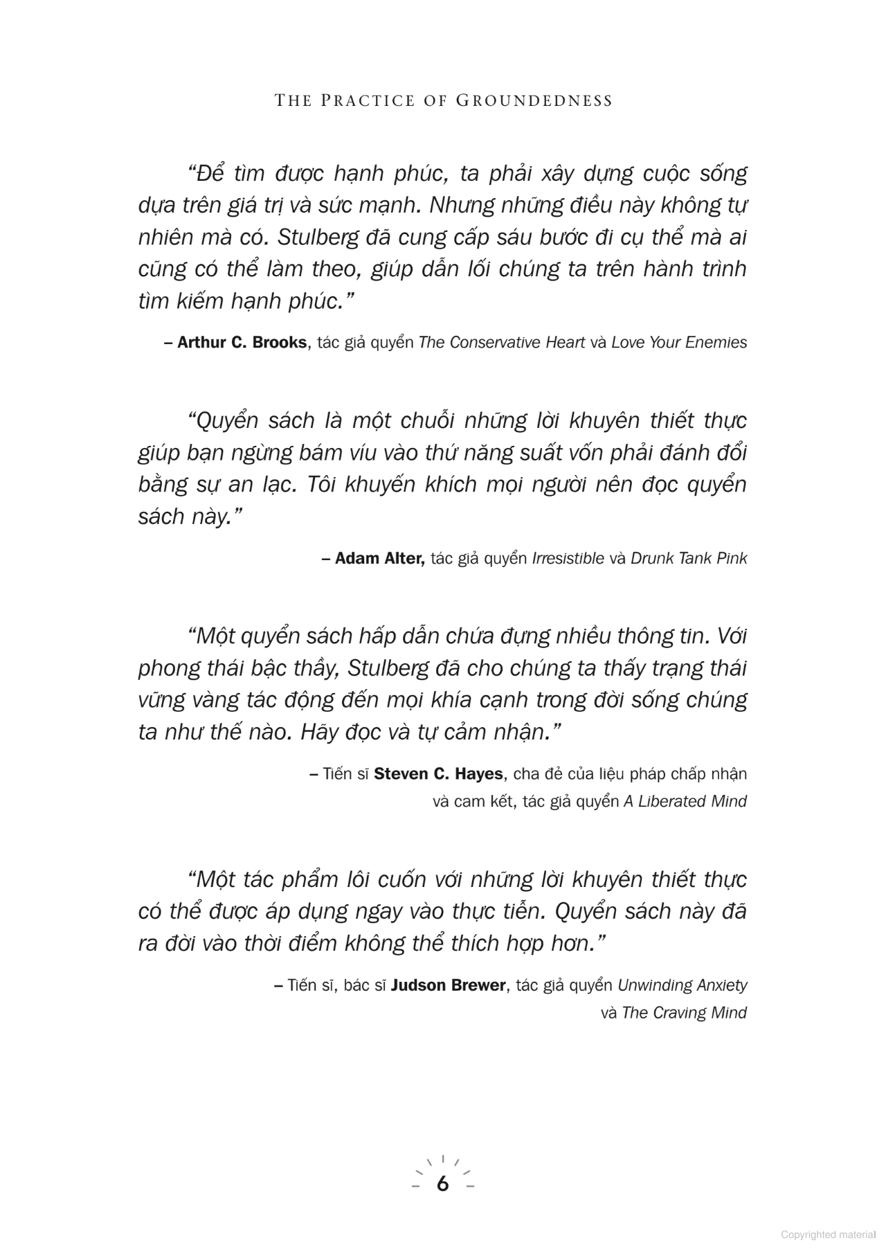Khép lại quyển sách này, hy vọng bạn sẽ chọn cho m.ình những nguyên tắc sống vững vàng thay cho chủ nghĩa cá nhân anh hùng, bao gồm thái độ chấp nhận thay vì chìm trong những ảo tưởng và suy nghĩ hão huyền; khả năng hiện diện trọn vẹn trong từng phút giây thay vì bị phân tâm; chọn lòng kiên nhẫn thay vì hối hả; chọn chấp nhận những điểm yếu thay vì mong muốn trở nên bất bại; chọn sự gắn kết cộng đồng hơn là sự tách biệt; và chọn vận động thể chất chứ không ngồi yên một chỗ.