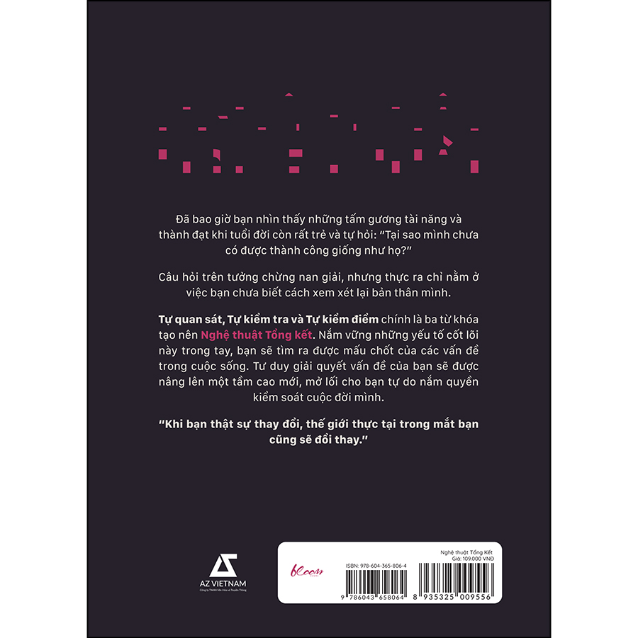Tự quan sát, Tự kiểm tra và Tự kiểm điểm chính là ba từ khóa tạo nên Nghệ thuật Tổng kết. Với kinh nghiệm 12 năm trong lĩnh vực giáo dục - đào tạo, quản trị nhân lực, chuyên gia Hư Châu sẽ giúp bạn khám phá được ý nghĩa của ba từ khóa đặc biệt trên, tìm ra được điểm mấu chốt của các vấn đề trong cuộc sống, từ đó biết cách áp dụng tư duy tổng kết trong cuộc sống, công việc và học tập. Nắm vững những yếu tố cốt lõi này trong tay, bạn sẽ tìm ra được mấu chốt của các vấn đề trong cuộc sống. Tư duy giải quyết vấn đề của bạn sẽ được nâng lên một tầm cao mới, mở lối cho bạn tự do nắm quyền kiểm soát cuộc đời mình.