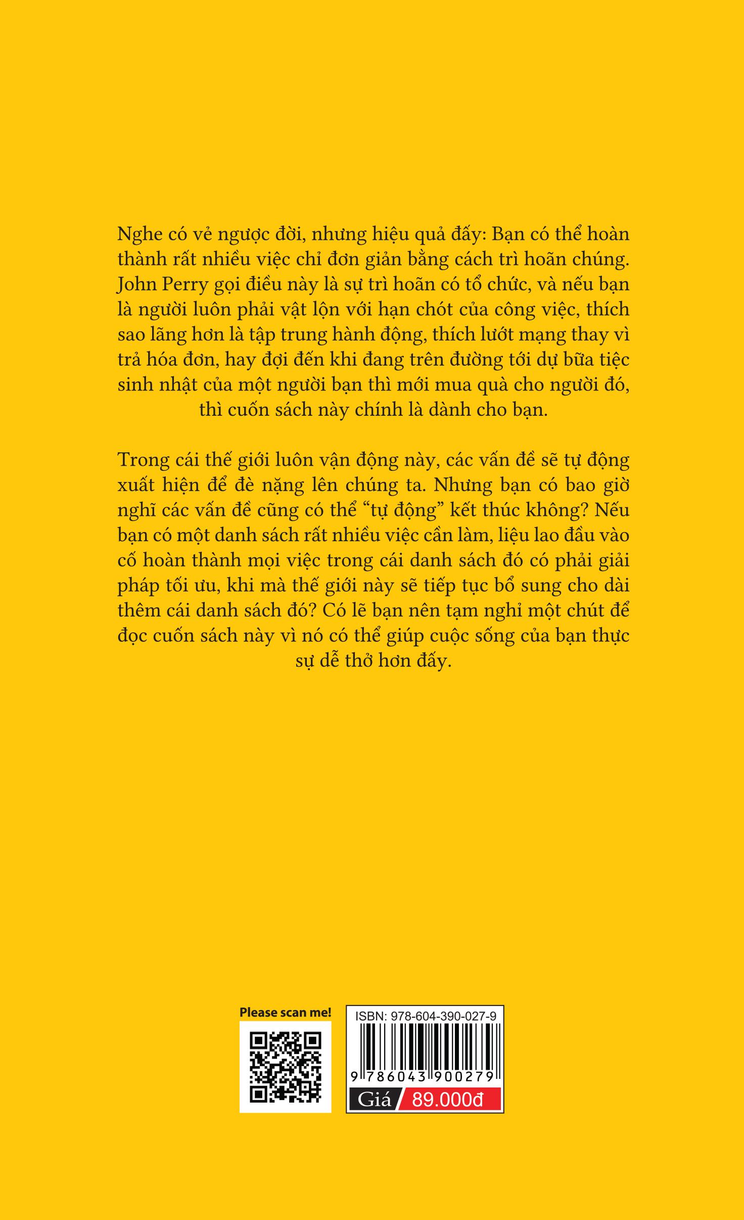 - TÓM TẮT NỘI DUNG Nghe có vẻ ngược đời, nhưng hiệu quả đây: Bạn có thể hoàn thành rất nhiều việc chỉ đơn giản bằng cách trì hoãn chúng. John Perry gọi điều này là sự trì hoãn có tổ chức và nếu bạn là người luôn phải vật lộn với hạn chót của công việc, thích sao lãng hơn là tập trung hành động, thích lướt mạng thay vì trả hóa đơn, hay đơi đến khi đang trên đường tới dự bữa tiệc sinh nhật của một người bạn thì mới mua quà cho người đó, thì cuốn sách này chính là dành cho bạn.