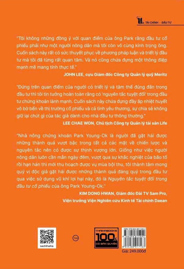 “Đứng trên quan điểm của người có triết lý và tâm thế đúng đắn trong đầu tư thì tôi tin tưởng hoàn toàn rằng có ‘nguyên tắc tuyệt đối’ trong đầu tư chứng khoán lành mạnh. Cuốn sách này chứa đựng đầy ắp nhiệt huyết vô bờ bến về thị trường cổ phiếu của tác giả và cả tình yêu thương, sự chia sẻ không tiếc nuối dành cho nhà đầu tư thông thường.” - LEE CHAE WON, Chủ tịch Công ty Quản lý tài sản Life