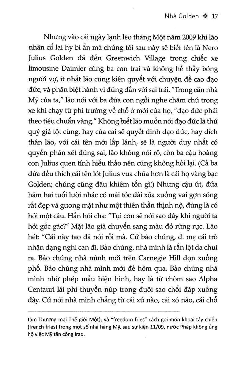 Cuộc tái hồi chủ nghĩa hiện thực đầy ngạo nghễ của Salman Rushdie được đánh dấu bằng “Nhà Golden” - một áng dụ ngôn bi tráng về nước Mỹ hiện đại. Lấy hai đầu mốc thời gian là thời điểm bắt đầu và kết thúc tám năm triều đại Obama, Nhà Golden xoay quanh số phận của bốn cha con từ vùng đất không được gọi tên đột ngột xuất hiện giữa trời New York một ngày định mệnh. Họ rũ bỏ quá khứ như rắn lột da, họ làm một phép biến hình như trong sử thi Ovid, và họ đâu ngờ chính họ là những kiến trúc sư cho cuộc sụp đổ của chính m.ình. Bằng thứ tiếng Anh khẩn trương và nóng rẫy như bầu không khí Ấn Độ quê hương, Rushdie đã đanh thép vạch mặt thiên đường tự do Mỹ trong cuộc khủng hoảng căn tính dai dẳng, trên nền bối cảnh náo động an ninh và tao loạn chính trị…