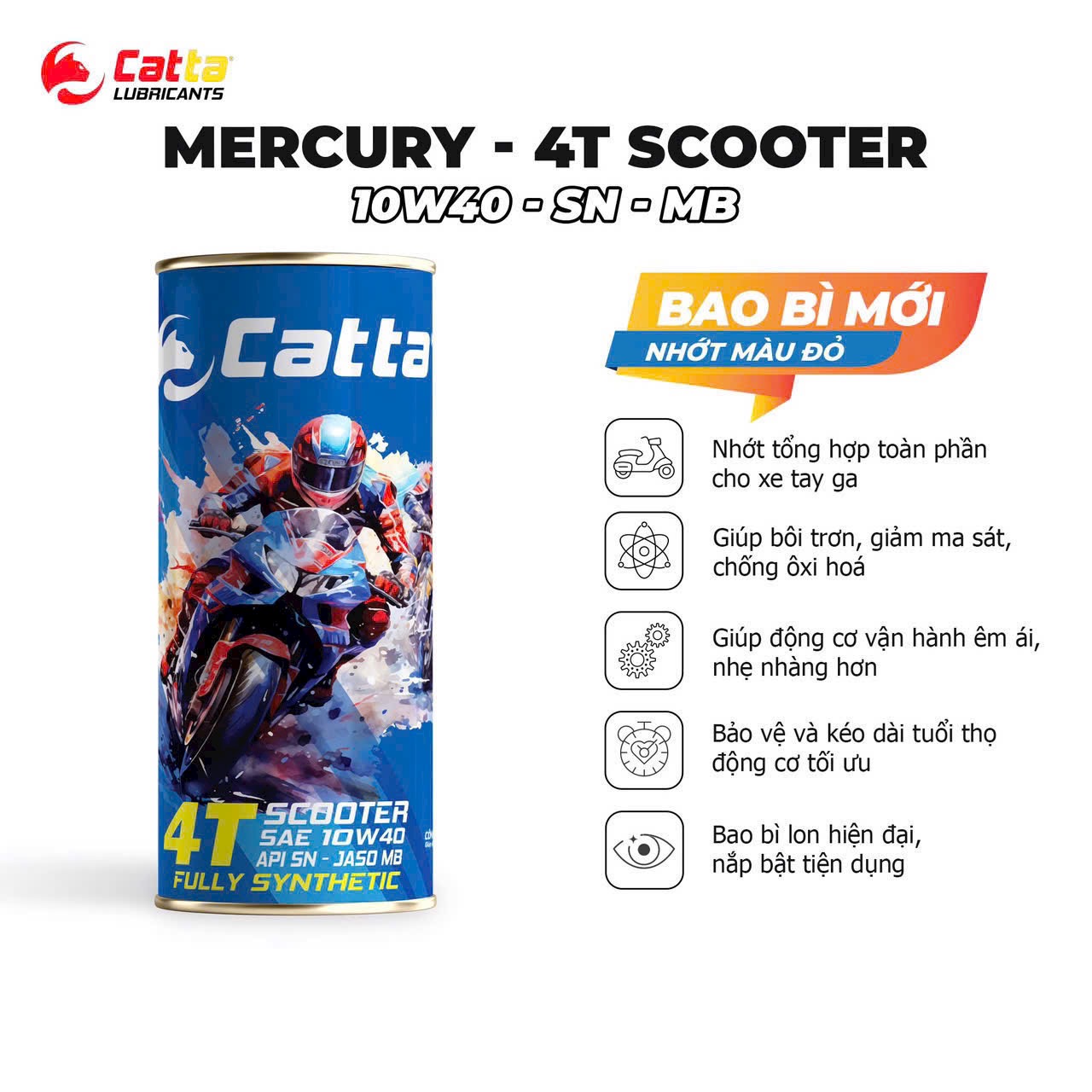 DẦU NHỚT TỔNG HỢP TOÀN PHẦN CHO XE TAY GA CATTA MERCURY – 4T SCOOTER SAE 10W40 – API SN – JASO MB – FULLY SYNTHETIC – 24/0.8L GIỚI THIỆU Dầu nhớt tổng hợp toàn phần