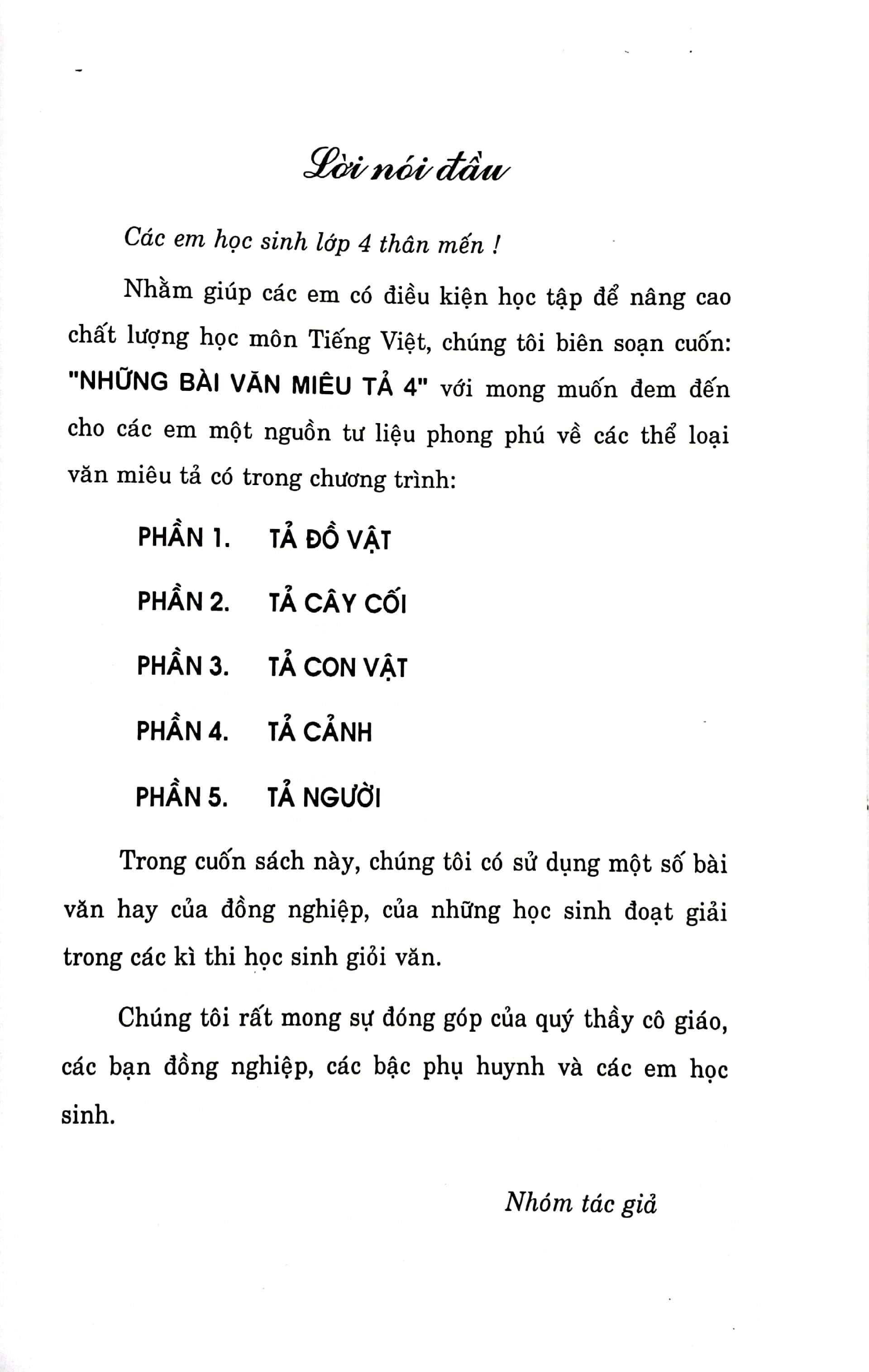 Nhằm giúp các em học sinh có điều kiện học tập để nâng cao chất lượng học môn Tiếng Việt, chúng tôi biên soạn cuốn: "NHỮNG BÀI VĂN MIÊU TẢ 4" với mong muốn đem đến cho các em một nguồn tư liệu phong phú về các thể loại văn miêu tả có trong chương trình: