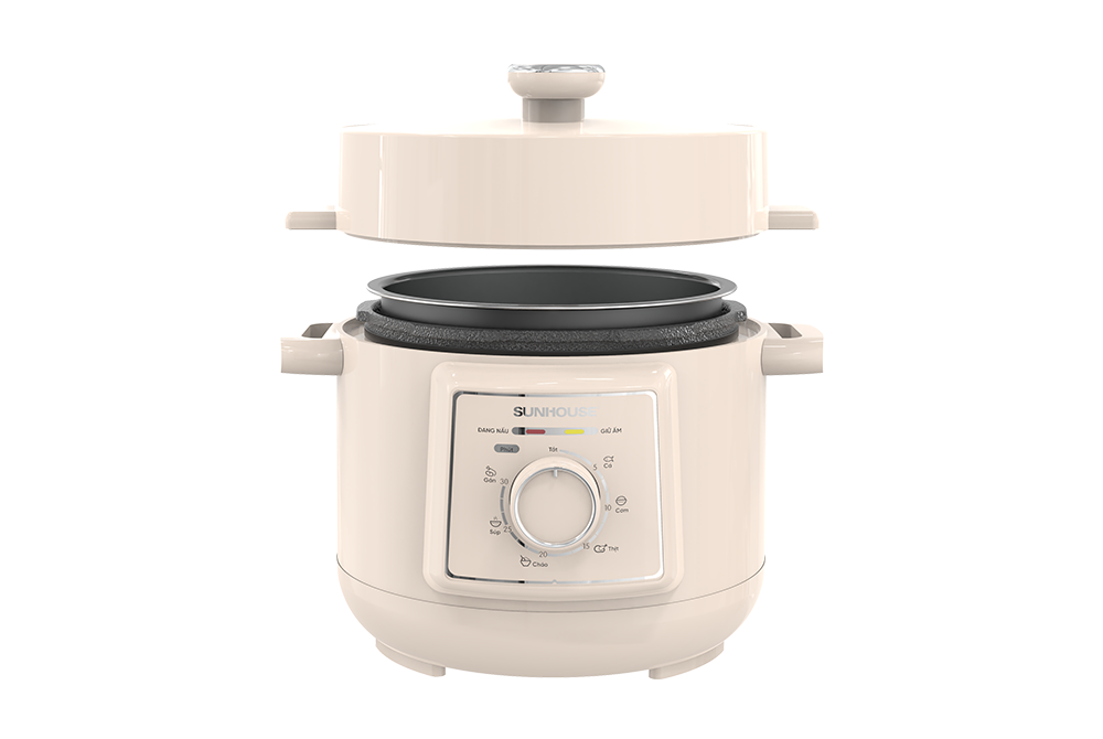 Nồi áp suất đa năng 2.5L SUNHOUSE SHD1520 là trợ thủ nhà bếp hiện đại dành cho những ai yêu thích sự tiện lợi mà vẫn đề cao dinh dưỡng. Với thiết kế gọn nhẹ, dung tích vừa đủ 2.5L cùng công suất mạnh mẽ, sản phẩm giúp bạn chế biến nhanh chóng đa dạng món ăn: từ ninh xương, hầm canh đến nấu cháo, nấu cơm,... Cơ chế nấu áp suất giúp thực phẩm chín mềm trong thời gian ngắn nhưng vẫn giữ nguyên dưỡng chất và hương vị, đáp ứng trọn vẹn cả nhu cầu ngon miệng lẫn tốt cho sức khỏe. Thiết kế nhỏ gọn, dễ sử dụng trong mọi không gian bếp Nồi áp suất đa năng 2.5L Sunhouse SHD1520 sở hữu kiểu dáng gọn nhẹ, tay cầm chắc chắn, thuận tiện khi di chuyển và bảo quản. Giao diện điều khiển đơn giản, dễ thao tác với núm xoay, phù hợp với nhiều đối tượng sử dụng - từ người lớn tuổi đến các bạn trẻ sống độc thân hoặc gia đình nhỏ. Dung tích 2.5L - Đa dạng món ăn Với dung tích 2.5L, sản phẩm đáp ứng tốt nhu cầu nấu ăn hằng ngày như nấu cơm, cháo, súp hay hầm xương cho 2 - 4 người. Đây là lựa chọn lý tưởng cho các gia đình ít người hoặc người dùng yêu thích thiết bị nhỏ gọn, tiện lợi mà vẫn đa năng. Lòng nồi dày 1.8mm - Giữ nhiệt tốt, bền bỉ dài lâu Lòng nồi cấu tạo từ hợp kim nhôm cao cấp, dày đến 1.8mm, giúp truyền và giữ nhiệt ổn định trong suốt quá trình nấu. Nhờ đó, thực phẩm chín đều, giữ nguyên vị ngon, đồng thời nồi có độ bền cao, dễ vệ sinh sau khi sử dụng. Xả áp bằng nút ấn an toàn tuyệt đối Nồi hoạt động với công suất mạnh mẽ giúp rút ngắn thời gian nấu, nhất là khi chế biến các món cần hầm lâu như cháo xương, súp gà hay canh thịt. Tính năng xả áp bằng nút ấn tiện lợi giúp giải phóng hơi an toàn, ngăn ngừa tình trạng bỏng hơi khi mở nắp, đảm bảo an tâm tuyệt đối cho người nội trợ.
