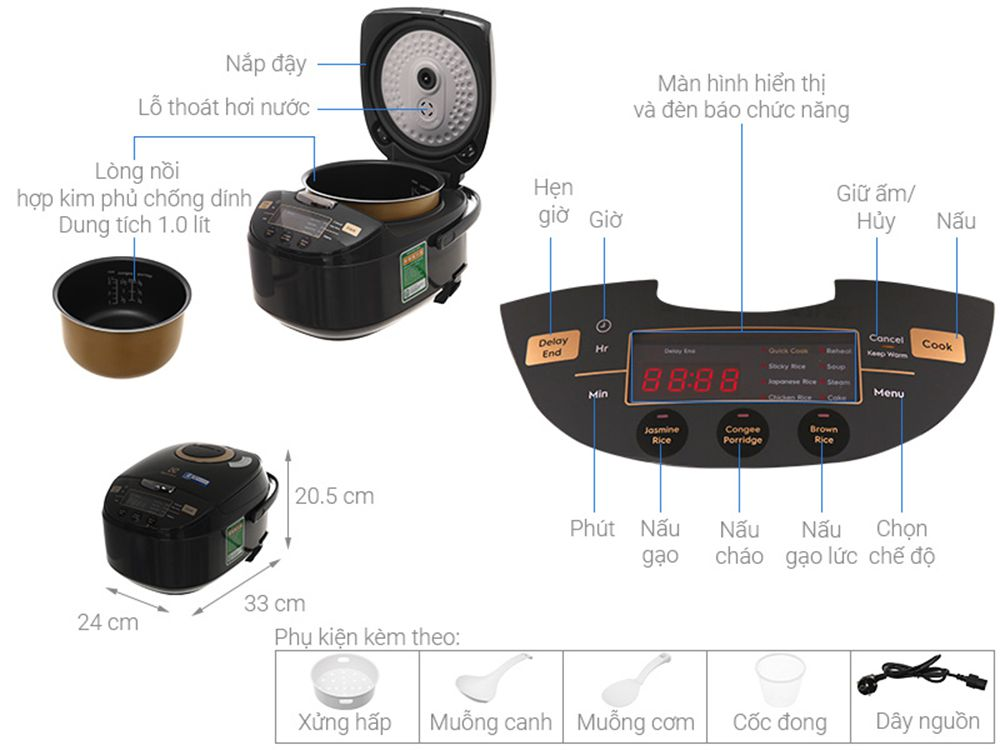 MENU ĐA NĂNG: • Chức năng nấu dinh dưỡng: Qunioa, Steel Cut Oatmeal, Brown, GABA Brown, Steam • Chức năng nấu cơm theo từng loại gạo: Long & Short Grain White, Premium, Congee(Thick & Thin),