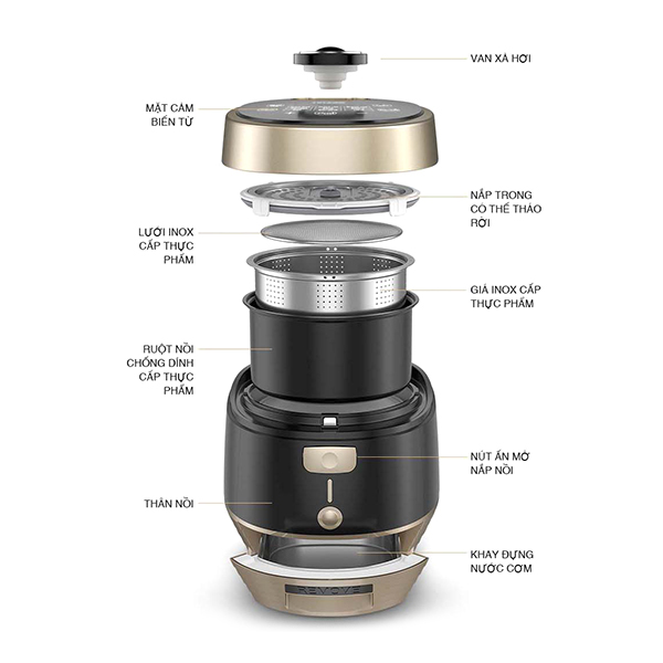 - Áp suất cực cao (2atm) - Chức năng nấu ăn mở - Mở nắp chuyển động an toàn 2 nấc - Nắp phụ không gỉ có thể tháo rời - Chức năng tiết kiệm