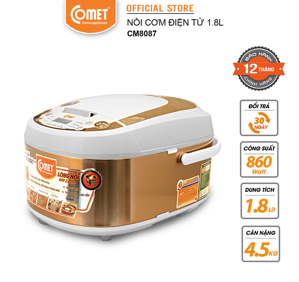 THÔNG TIN KỸ THUẬT: 1. Thương hiệu: Comet. 2. Sản phẩm: Nồi cơm điện tử. 3. Mã sản phẩm: CM8087. 4. Điện áp: 220V - 50Hz. 5. Công suất: 860W. 6. Dung tích: 1,8l. 7.