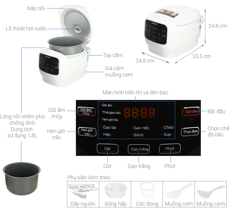 Nồi cơm điện tử Sharp 1.8 lít KS-COM194EV Dung tích: 1.8 lít Công suất: 790W 8 chức năng (Nấu tiêu chuẩn, Nấu nhanh, Gạo lứt, Cơm niêu, cháo, Súp, Hấp, Luộc trứng) Lòng nồi phủ
