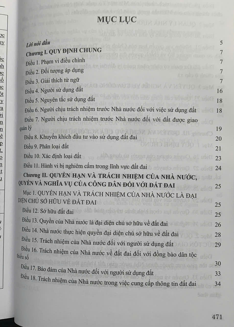 Luật Đất đai năm 2024 có 16 chương, tăng 02 chương so với Luật Đất đai năm 2013 do bổ sung chương Phát triển, quản lý và khai thác quỹ đất (Chương VIII), tách riêng chương Thu hồi đất, trưng dụng đất (Chương VI) và Bồi thường, hỗ trợ, tái định cư khi Nhà nước thu hồi đất (Chương VII); thứ tự sắp xếp các chương của Luật Đất đai năm 2024 không giữ nguyên như Luật Đất đai năm 2013 mà được sắp xếp, bố cục theo trình tự thực hiện các nhiệm vụ quản lý nhà nước về đất đai để tiện theo dõi, tra cứu và thuận lợi hơn trong triển khai thi hành Luật nên thứ tự các điều luật của Luật Đất đai năm 2024 và Luật Đất đai năm 2013 không song hành với nhau. Chính vì vậy, để tra cứu và thực thi Luật Đất đai năm 2024 được thuận lợi, cuốn sách này thiết kế 02 cột Luật (cột Luật Đất đai năm 2013 và cột Luật Đất đai năm 2024), trong đó, tại cột Luật Đất đai năm 2024 trình bày các điều luật theo thứ tự tự nhiên (từ Điều 1 đến Điều 260), còn cột Luật Đất đai năm 2013 (văn bản hợp nhất Luật Đất đai năm 2013) trình bày các điều luật có nội dung tương ứng với điều luật bên cột Luật Đất đai năm 2024 nên không theo thứ tự tự nhiên (từ Điều 1 đến Điều 212).