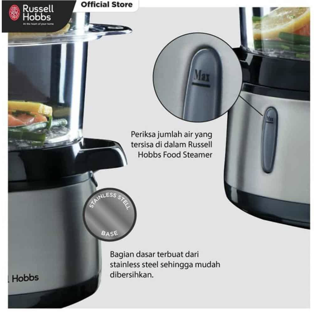 Mua tại Tiktok– Nồi hấp điện 3 tầng Russell Hobbs có thể giúp cho thực phẩm như: cơm, rau, cá duy trì được chất dinh dưỡng và vitamin ở mức tối đa. – Nồi có 3 tầng với tổng dung tích 9 lít và 2 cửa cấp nước bên hông. – Bộ đếm thời gian 60 phút với công tắc tự động tắt. – Tất cả các bộ phận tiếp xúc với thực phẩm đều không có BPA, an toàn cho sức khỏe người sử dụng. – Công suất 800W. – 100% nhập khẩu từ Đức & EU Các món ăn được chế biến theo phương pháp hấp luôn là những món ăn phù hợp với rất nhiều người, không những giữ được hương vị tươi ngon đúng chuẩn của món ăn mà các món hấp còn tốt cho sức khỏe. Tổng Quan Về Nồi Hấp Điện Russell Hobbs 19270-56