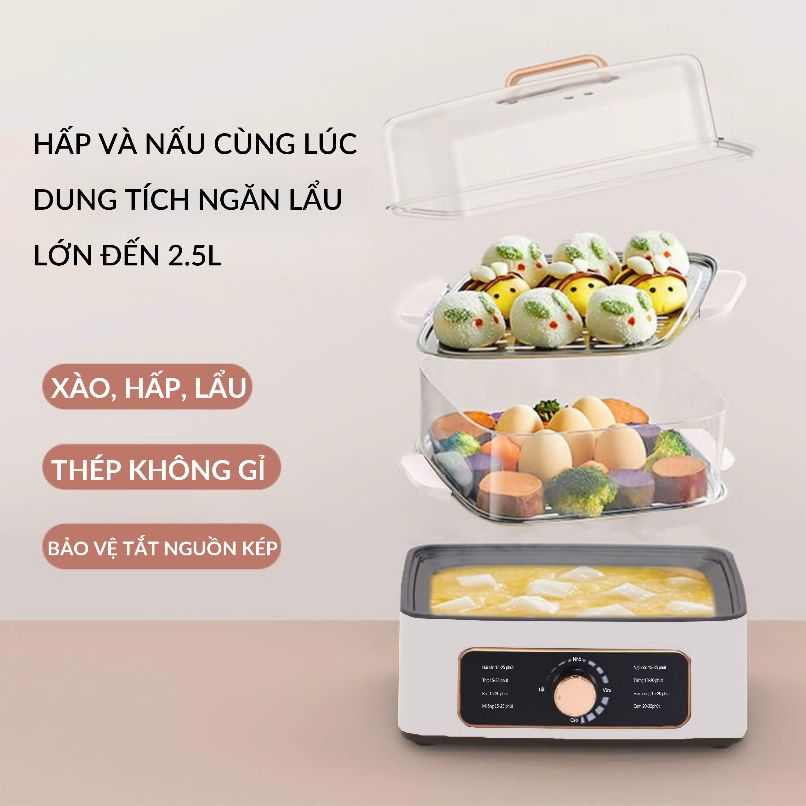 Mua tại TiktokĐẶC ĐIỂM NỔI BẬT -6 chế độ thiết lập sẵn đa dạng: Hấp, Hầm thịt, Nấu lẩu, Nấu xào, Hầm, Giữ ấm -2 chế độ tinh chỉnh không giới hạn: Hẹn giờ và các mức độ -2 tầng hấp, lẩu kết hợp. -Tối đa hóa nhu cầu và mục đích sử dụng -Dung tích tổng thể lên đến 22L hấp, hầm được nhiều thực phẩm cùng lúc