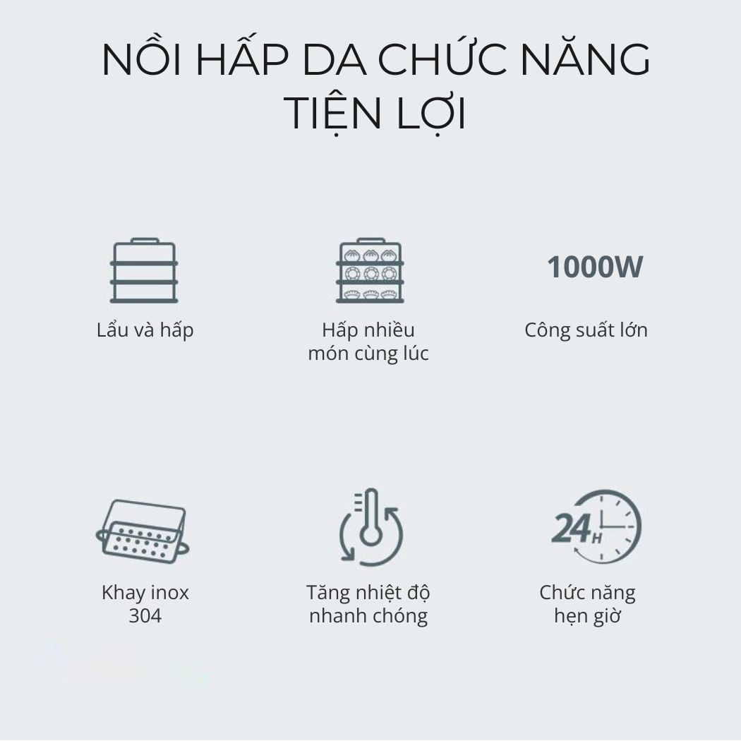 • Nấu nướng đa năng: Nồi có thể sử dụng để nấu lẩu, nấu cháo, hấp thực phẩm,... giúp bạn tiết kiệm thời gian và công sức nấu nướng.