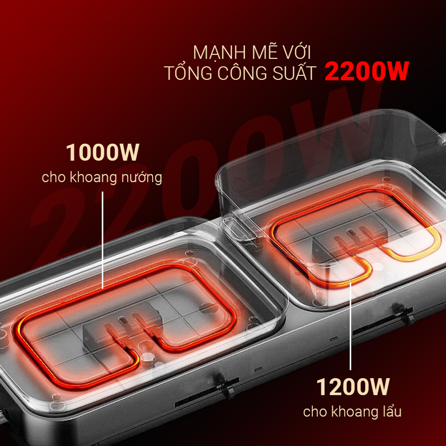 Công suất: 2200W (1000W cho nướng và 1200W cho lẩu)