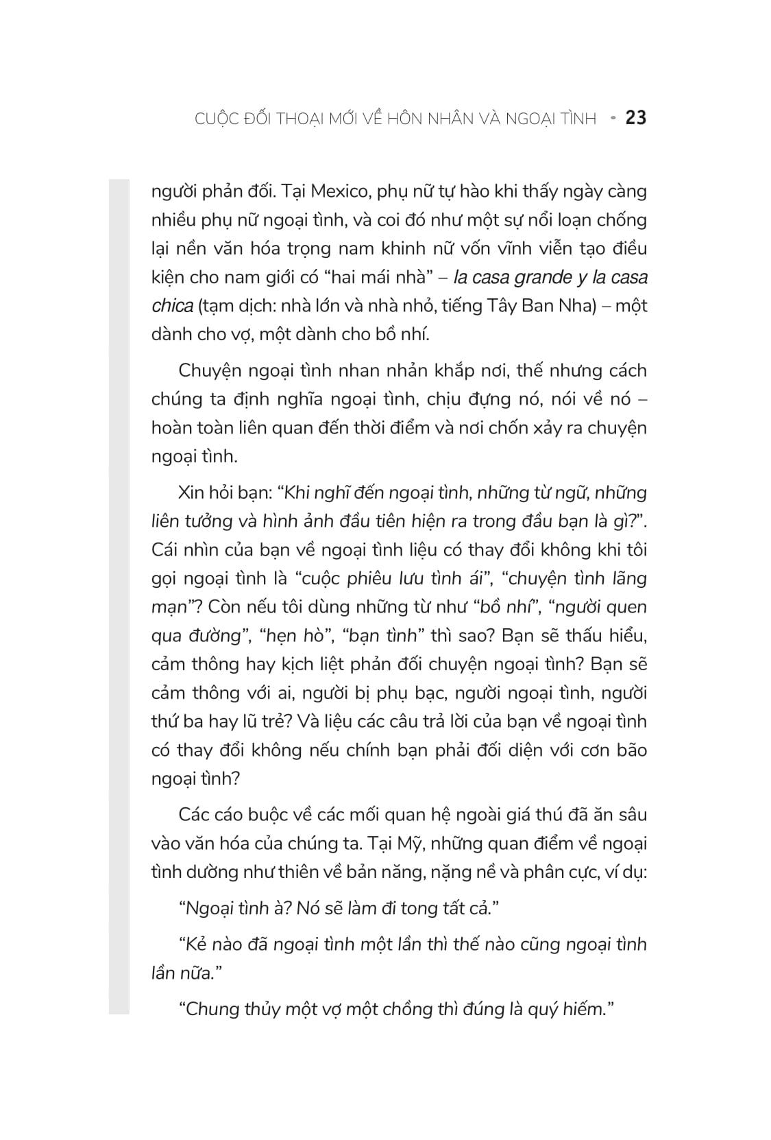 Ngày nay một cuộc đối thoại về các mối quan hệ bất chính dễ mang tính chia cắt, phán xét, và có lối suy nghĩ thiển cận. Xét dưới góc một nền văn hóa, chúng ta chưa khi nào cởi mở về tình dục hơn ngày nay, nhưng sự bội bạc vẫn còn chìm khuất đằng sau một đám mây của sự hổ thẹn và giấu giếm. Tôi hy vọng quyển sách này sẽ giúp xua đi sự im lặng ấy và mở ra một lối suy nghĩ và diễn đạt mới mẻ cho một trong những điều xưa cổ nhất trong cuộc sống của con người. Rất nhiều người đã viết ra cách ngăn ngừa và chữa lành sau khi sự đã xảy ra; nhưng ít ai viết về ý nghĩa và động cơ của các mối quan hệ bất chính. Càng ít hơn nữa những người nói về những điều mà chúng ta có thể học được từ các mối quan hệ và làm thế nào để kiến thức ấy có thể biến đổi và hoàn thiện các mối quan hệ của chúng ta.
