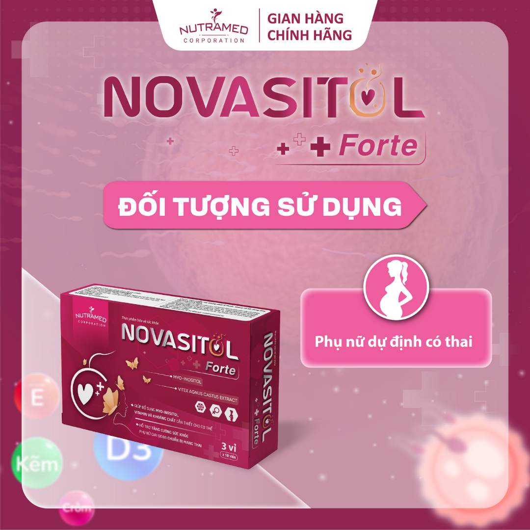 THÀNH PHẦN ️ Myo-Inositol, Vitex agnus castus extract (chiết xuất cây Trinh nữ châu Âu), N-Acetyl L-Cysteine, Magie (Magie oxide), Kẽm (Kẽm sulfat monohydrate), Folic acid (Calci-L-methyl-folate), Crôm (Crom picolinate), Selenium (Natri selenite), Vitamin D3 (Cholecalciferol), Vitamin E (DL-alpha-tocopherol).   CÔNG DỤNG   ️ Giúp bổ sung Myo-inositol, vitamin và khoáng chất cần thiết cho cơ thể, hỗ trợ tăng cường sức khỏe phụ nữ giai đoạn chuẩn bị mang thai.   ĐỐI TƯỢNG SỬ DỤNG ️ Phụ nữ dự định có thai.   HƯỚNG DẪN SỬ DỤNG ️ Ngày uống 2 viên, sáng uống 1 viên, chiều uống 1 viên, uống sau khi ăn.   KHÔNG SỬ DỤNG TRONG TRƯỜNG HỢP ️ Người mẫn cảm với bất kỳ thành phần nào của sản phẩm.   LƯU Ý ️ Không uống sản phẩm cùng nước có gas, cafein, trà. Trong thời gian sử dụng sản phẩm không được sử dụng rư,ợu bi,a, thu,ốc l,á. Có thể có rối loạn dạ dày ruột nhẹ khi mới bắt đầu dùng Novasitol forte. Tuy nhiên các rối loạn nhẹ này sẽ tự hết trong 3-4 ngày.  ️ Thực phẩm này không phải là thuốc, không có tác dụng thay thế thuốc chữa bệnh. BẢO QUẢN ️ Nơi khô ráo, nhiệt độ dưới 30°C, tránh ánh sáng mặt trời. Để xa tầm tay trẻ em. THÔNG TIN SẢN PHẨM Sản phẩm: NOVASITOL Forte Quy cách đóng gói: Hộp 3 vỉ x 10 viên. Hạn sử dụng: 36 tháng kể từ ngày sản xuất. Tiêu chuẩn: TCCS   Nutramed - Khơi Nguồn Khoa Học Tới Cuộc Sống Nhà máy đạt chuẩn WHO – GMP, nguyên liệu kiểm tra chất lượng nghiêm ngặt, đảm bảo an toàn và hiệu quả.
