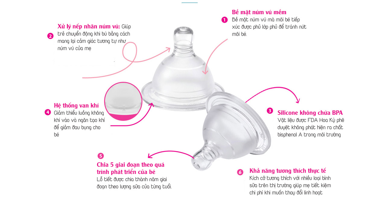 - Xử lý nếp nhăn núm vú: Giúp trẻ chuyển động khi bú bằng cách mang lại cảm giác tương tự như núm vú của mẹ Hệ thống van khí: Giảm thiểu luồng không khí vào và ngăn tạo khí để giảm đau bụng cho bé