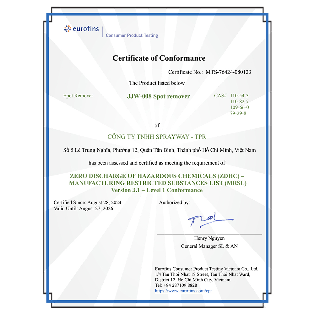 Mua tại TiktokNƯỚC TẨY BẨN QUẦN ÁO THÂN THIỆN MÔI TRƯỜNG Được sản xuất với công nghệ tiên tiến với khả năng tẩy hiệu quả cao, là trợ thủ đắc lực cho các nhà máy may mặc, sản phẩm có khả năng tẩy sạch các vết bẩn trên nhiều loại vải, da, len,.. Được cấp chứng nhận ZDHC MRSL V3.1 7 ĐẶC TÍNH JJW-008: Dạng lỏng Màu trong suốt Mùi hương nhẹ Sản phẩm thân thiện với môi trường Hiệu quả tức thì Tẩy sạch sẽ không để lại dấu vết Giá thành hợp lý Hiệu quả tốt khi kết hợp với súng phun