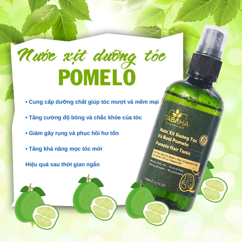 NƯỚC DƯỠNG TÓC TINH DẦU VỎ BƯỞI POMELO TABAHA 120ML Thành phần chính Nước dưỡng tóc tinh dầu bưởi (pomelo hair tonic) Tabaha 120ml: - Tinh dầu vỏ bưởi: Do có tính kháng khuẩn và