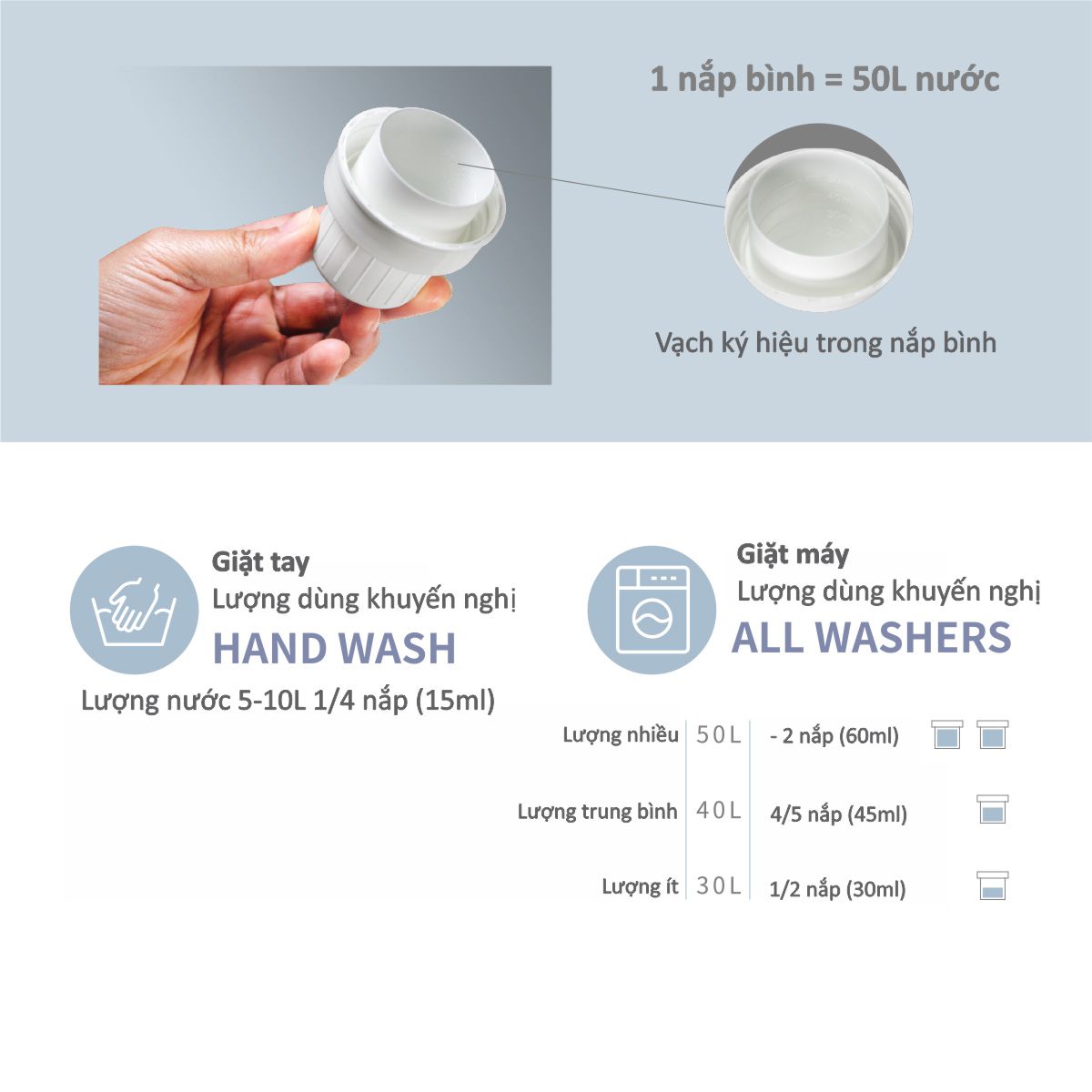 • Có vạch chia thể tích trong nắp bình, 1 nắp bình sử dụng với 50L nước.