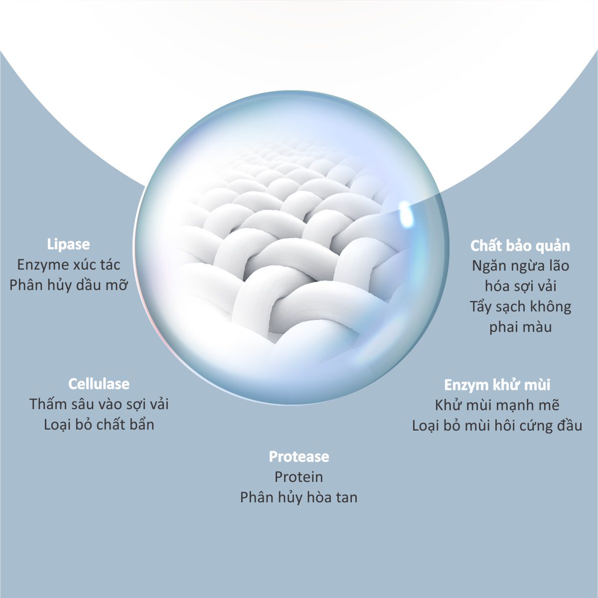 • Chứa Enzyme Lipase, Enzyme sợi nhỏ, Enzyme phân giải protein, Enzyme khử mùi, chất bảo quản và các thành phần khác, thấm sâu vào sợi vải để loại bỏ Enterovirus và Coronavirus mới trên quần áo, đồng thời loại bỏ chất bẩn và mùi hôi cứng đầu;