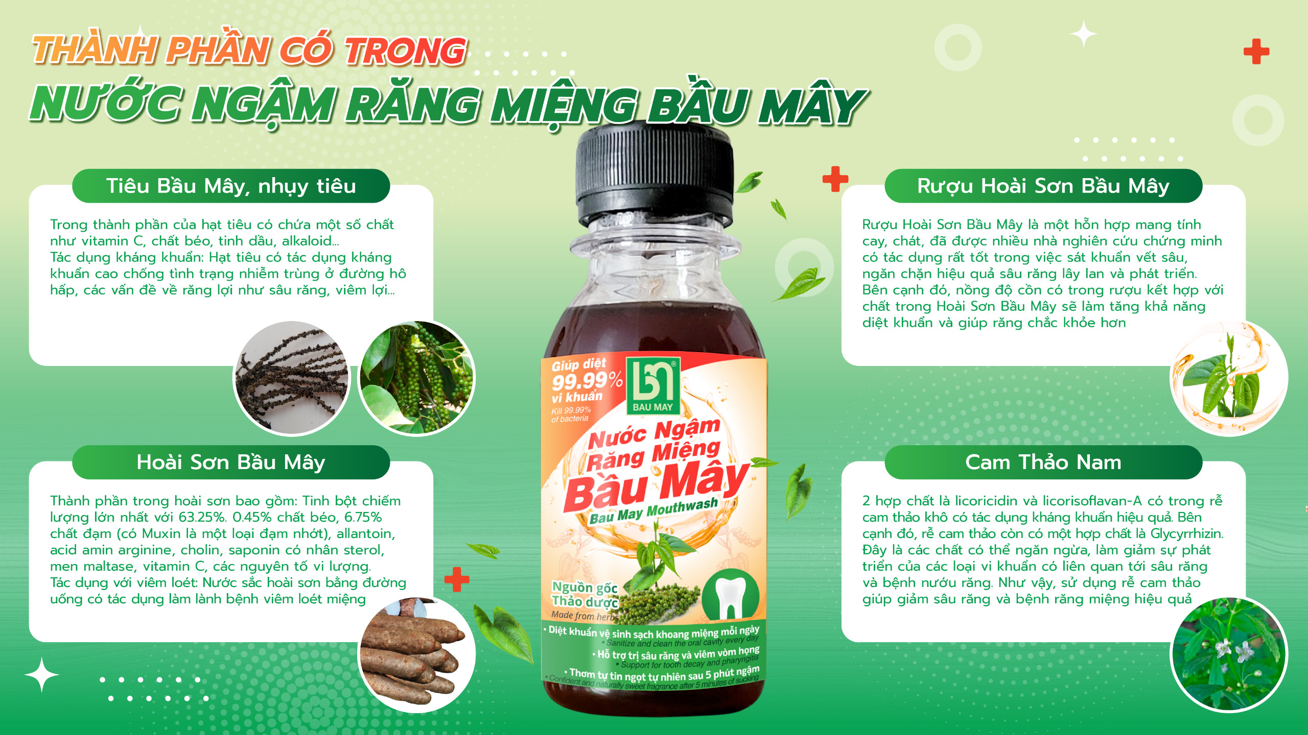 Nước ngậm răng miệng Bầu Mây là sản phẩm được chế biến từ các thành phần tự nhiên như Tiêu Bầu Mây, nhụy tiêu, Hoài sơn Bầu Mây, rượu Hoài sơn Bầu Mây và cam