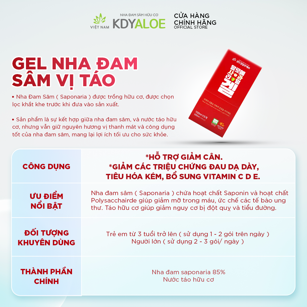 Nước nha đam sâm táo hữu cơ KDY ALOE * Thương hiệu: KDY ALOE * Xuất xứ: Hàn Quốc * Quy cách: 30gói/hộp * Dung tích: 100ml/ gói * Dạng: gel * Thành phần chính:
