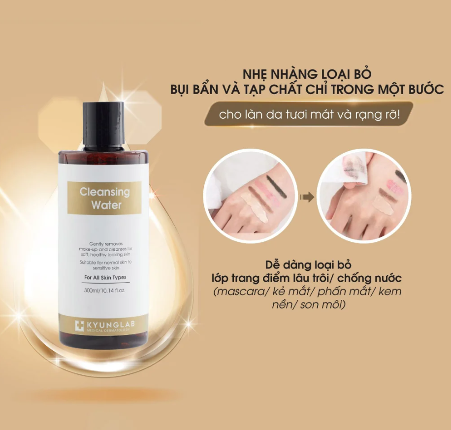 CÔNG DỤNG CHÍNH CỦA NƯỚC TẨY TRANG KYUNGLAB CLEANSING WATER   Sở hữu Nước Tẩy Trang KyungLab Cleansing Water giúp: » Nhẹ nhàng loại bỏ cặn bã của lớp trang điểm, bụi bẩn còn sót lại trên da giúp làm sạch sâu cho làn da mềm mại, khỏe mạnh. ĐỐI TƯỢNG SỬ DỤNG NƯỚC TẨY TRANG KYUNGLAB CLEANSING WATER Sản phẩm Nước Tẩy Trang Sạch Sâu Kyung Lab Cleansing Water phù hợp: Mọi loại da, rất thích hợp từ loại da thường cho đến da nhạy cảm. » Những ai có nhu cầu muốn tẩy đi lớp cặn trang điểm một cách sạch sâu   THÀNH PHẦN CHÍNH CỦA NƯỚC TẨY TRANG KYUNGLAB CLEANSING WATER Được nghiên cứu và cho ra đời với các thành phần tự nhiên, lành tính như: » HA đa phân tử » Trà xanh Hadong » Chiết xuất rau sam » Chiết xuất hoa trà Nhật Bản » Bơ hạt mỡ lên men     CÁCH SỬ DỤNG NƯỚC TẨY TRANG KYUNGLAB CLEANSING WATER   Cách dùng: Bước 1: Làm ướt bông tẩy trang rồi nhẹ nhàng chuyển động xoay tròn đều khắp làn da, bắt đầu từ 2 bên má – trán – mũi – cằm. Bước 2: Làm sạch hoàn toàn cả khuôn mặt, lặp lại các bước trên cho tới khi bạn không còn nhìn thấy cặn trang điểm trên bông tẩy trang. Lưu ý: Nên vặt chặt đầu sản phẩm Cleansing Water KyungLab lại sau khi sử dụng xong. Lời khuyên: Nên dùng kết hợp với sản phẩm Sữa Rửa Mặt KyungLab Cleansing Gel để đạt hiệu quả tối ưu.   LƯU Ý KHI SỬ DỤNG NƯỚC TẨY TRANG SẠCH SÂU KYUNGLAB » Bảo quản nơi khô ráo, tránh ánh nắng trực tiếp với mặt trời