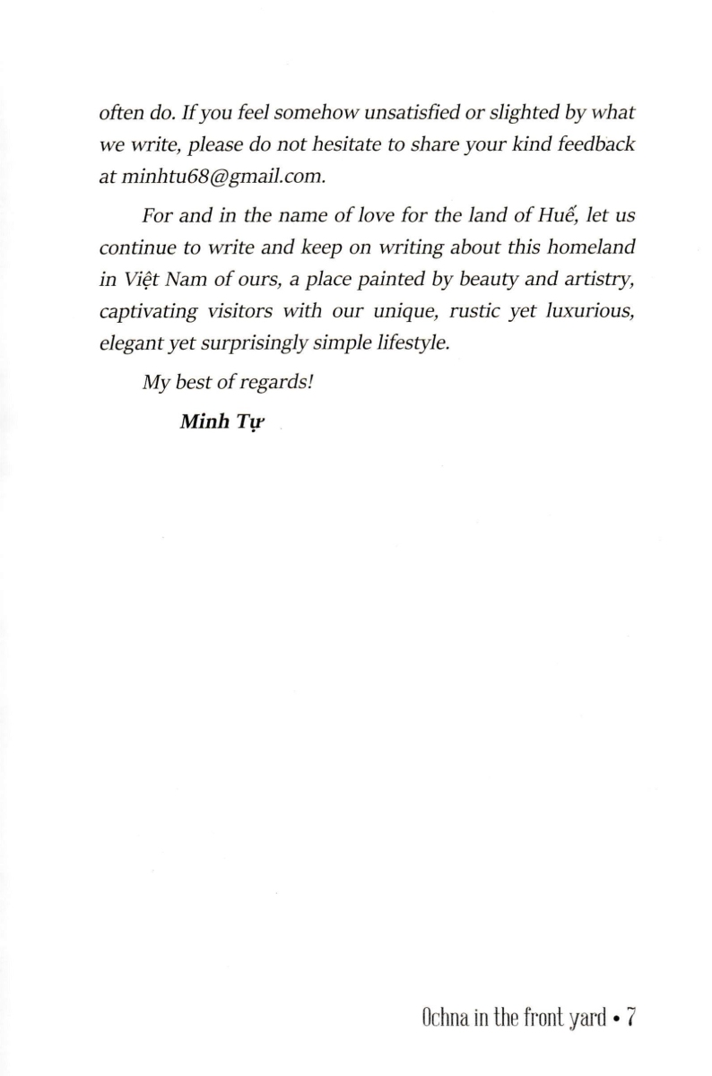 Mua tại TiktokOchna In The Front Yard - Fascinating Stories About Huế - An Ancient, Poetic And Glamorous Land GIỚI THIỆU SÁCH: Ochna In The Front Yard - Fascinating Stories About Huế - An Ancient, Poetic And Glamorous Land là tập ghi chép về “nước Huế” phong rêu kiêu sa của nhà báo Minh Tự. Hơn ba mươi bài viết của tác giả trong cuốn sách sách hầu hết được viết vào những năm 2000 - 2002, khi anh từ Đà Lạt trở về quê hương sau gần 10 năm tha phương; và trong lần tái bản này, tác giả có cập nhật, chỉnh sửa các bài viết cho hoàn thiện thêm, cùng hình ảnh minh họa sinh động. Tập ghi chép đã khắc họa đậm nét văn hóa, lối sống của người Huế dưới các góc nhìn khác nhau, từ chuyện ăn theo lối Huế, chuyện cơm hến, mè xửng, tô bún bò đến đường kim mũi chỉ, vành nón bài thơ, gốc mai lão trượng hay phiên chợ khuya, mà với tác giả, đó là “lối Huế”. Chia sẻ về đứa con tinh thần của mình, tác giả Minh Tự nói: “Những tháng năm tôi được làm một người Huế sống ngoài Huế, và nhờ vậy mới hiểu rõ hơn, một cách khách quan hơn, về bản sắc riêng biệt của xứ sở nà Cuốn sách này xin cùng khám phá nghệ thuật sống của người Huế, dù không thể nói hết muôn màu muôn vẻ của ‘lối Huế’. Nó chỉ là những trạng thái của Huế được chúng tôi ‘đọc’ được và thuật lại bằng cách của một người viết báo.”