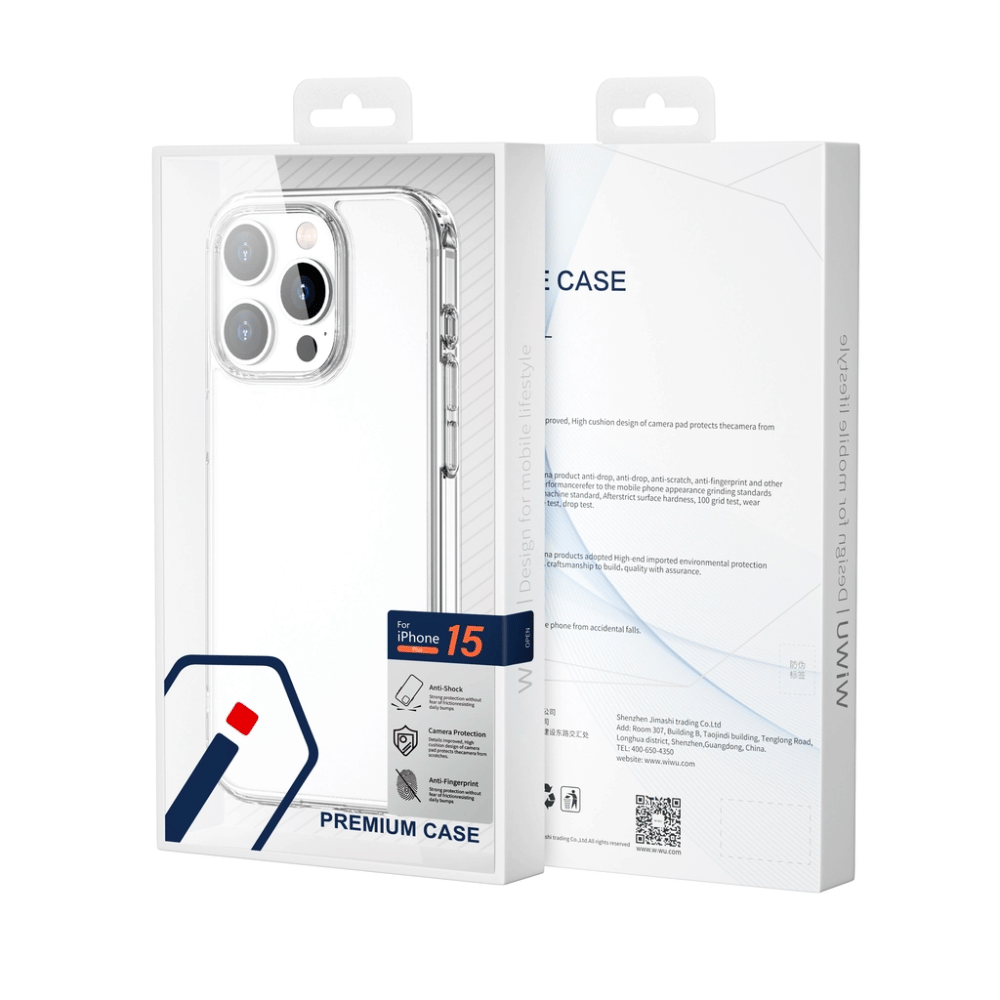 Ốp IPHONE 15 Pro/ 15 Pro Max trong suốt WiWU có viền màn hình và khung camera được thiết kế phần rìa nhô cao hơn. Để tránh các trường hợp rủi ro do va chạm gây nứt, vỡ mặt kính.