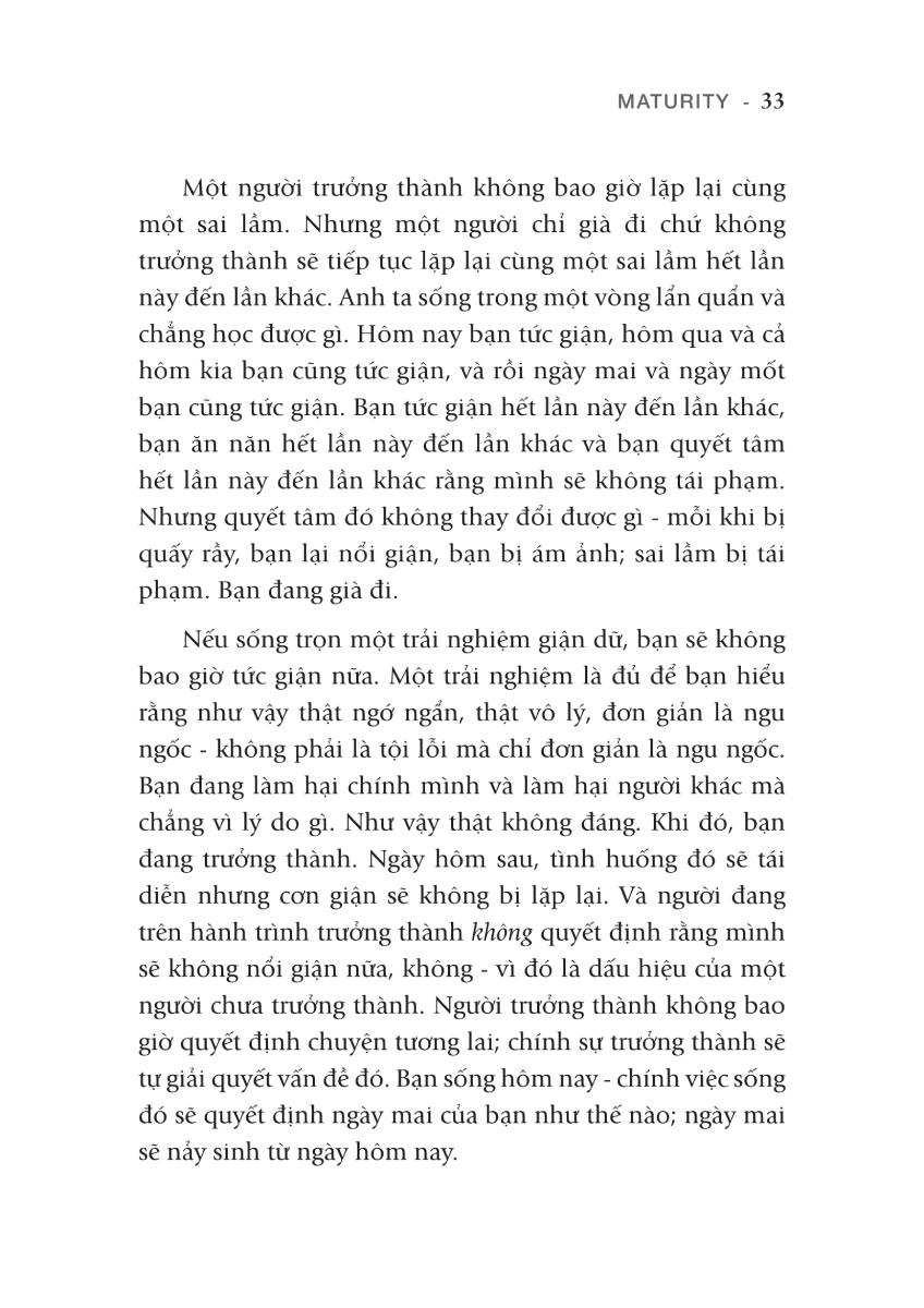“Bất kỳ con vật nào cũng có thể già đi, nhưng trưởng thành là đặc quyền của con người”, theo lời Osho: “Hãy làm con người như bạn vốn là. Đừng bao giờ cố gắng trở thành ai khác, và như thế, bạn sẽ trưởng thành. Trưởng thành là đón nhận trách nhiệm của việc làm chính mình, bằng mọi giá. Chấp nhận mọi rủi ro để làm chính mình, đó chính là trưởng thành”. Có thể thấy trưởng thành không phải là quá trình hướng đến những mục tiêu bên ngoài, mà là hành trình tiến sâu vào bên trong bản thể, hay nói như tác giả là chạm tới bầu trời nội tâm của mình.
