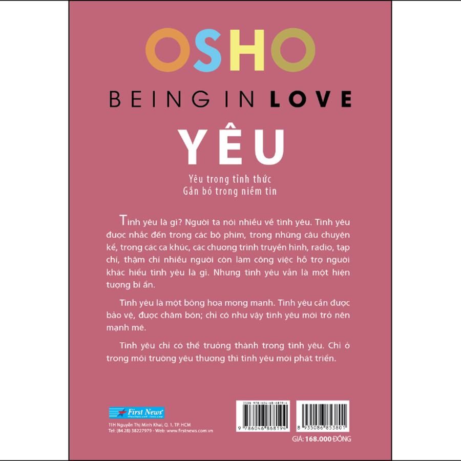 Những người đói khát trong nhu cầu, những người luôn kỳ vọng ở tình yêu chính là những người đau khổ nhất. Hai kẻ đói khát tìm thấy nhau trong một mối quan hệ yêu đương cùng những kỳ vọng người kia sẽ mang đến cho mình thứ mình cần – về cơ bản sẽ nhanh chóng thất vọng về nhau và cùng mang đến ngục tù khổ đau cho nhau. Trong cuốn sách Yêu, Osho - bậc thầy tâm linh, người được tôn vinh là một trong 1000 người kiến tạo của thế kỷ 20 – đã đưa ra những kiến giải sâu sắc về nhu cầu tâm lý có sức mạnh lớn nhất của nhân loại và “chỉ cho chúng ta cách trải nghiệm tình yêu”.