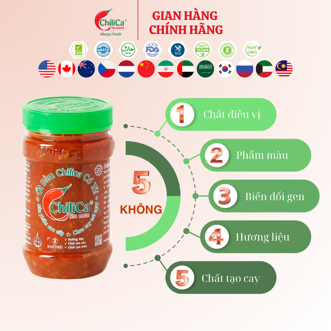 Ớt bằm Chilica có tỏi không sử dụng chất tạo màu, tạo mùi, tạo cay, chất độn. Từ khâu đầu tiên đến khâu cuối cùng đều được tự dộng hóa, giảm thiểu tối đa sự tác động của con người.