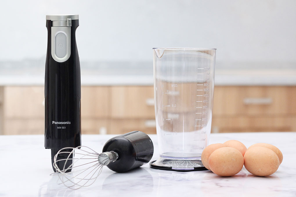 Máy xay sinh tố cầm tay Panasonic PASO-MX-SS1BRA được trang bị 1 cây xay, 1 cây đánh trứng và 1 cốc đo bằng nhựa cao cấp dễ vệ sinh.